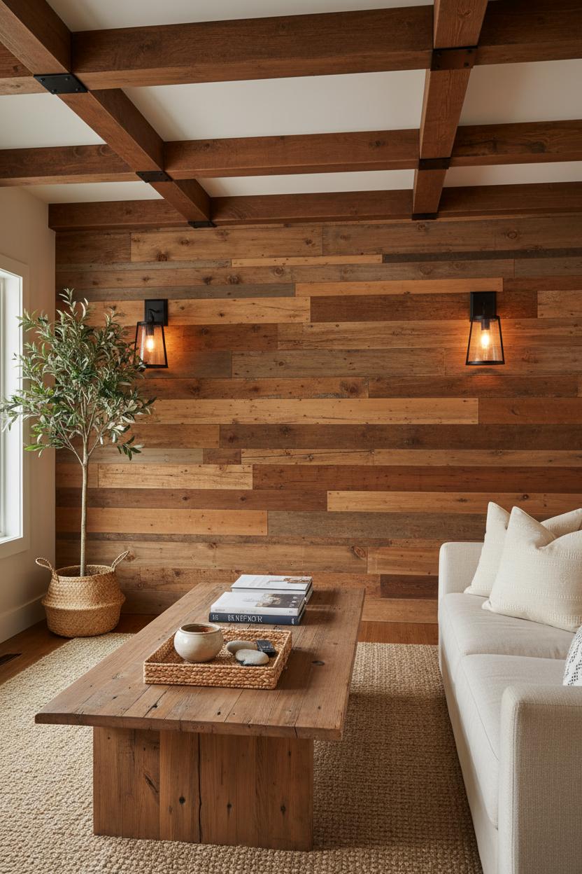 Finally, anchor your seating with a reclaimed wood coffee table—chunky, low, and beautifully imperfect. The nicks and knots are part of the charm and hide real-life wear and tear. Style it with a woven tray, a stack of favorite design books, and a ceramic bowl for remotes, then round out the scene with farmhouse throw pillows and a nubby jute area rug that adds natural texture underfoot. A tall faux olive tree in an oversized basket brings height and a whisper of green, softening all the wood and stone. These reclaimed wood ideas layer effortlessly into a cozy living room, delivering character you can feel—handsome, timeworn, and endlessly welcoming.