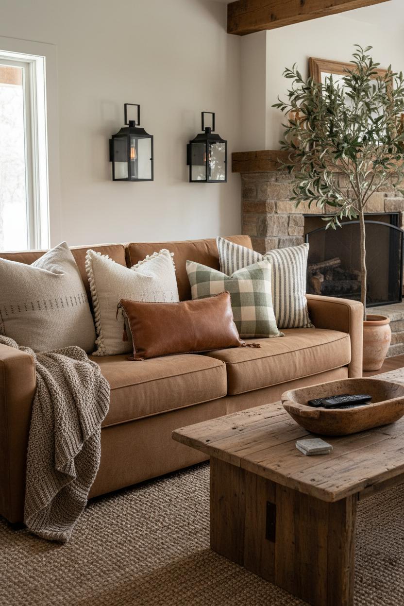 Lighting and accents will make the pillows sing. Flank the sofa with lantern sconces for a soft, fireside glow that deepens those woven shadows, and tuck a faux olive tree in the corner for height and a serene, organic silhouette. If you’re craving reclaimed wood ideas, corral remotes and coasters on a weathered tray or a simple dough bowl on the coffee table to echo the wood tones and keep things tidy. The beauty of this look is its flexibility: swap a couple of covers when the seasons change—terracotta and moss for fall, dove and flax for summer—and the whole seating area feels refreshed. It’s a small, low-commitment styling move with big impact, wrapping your space in comfort and character one pillow at a time.