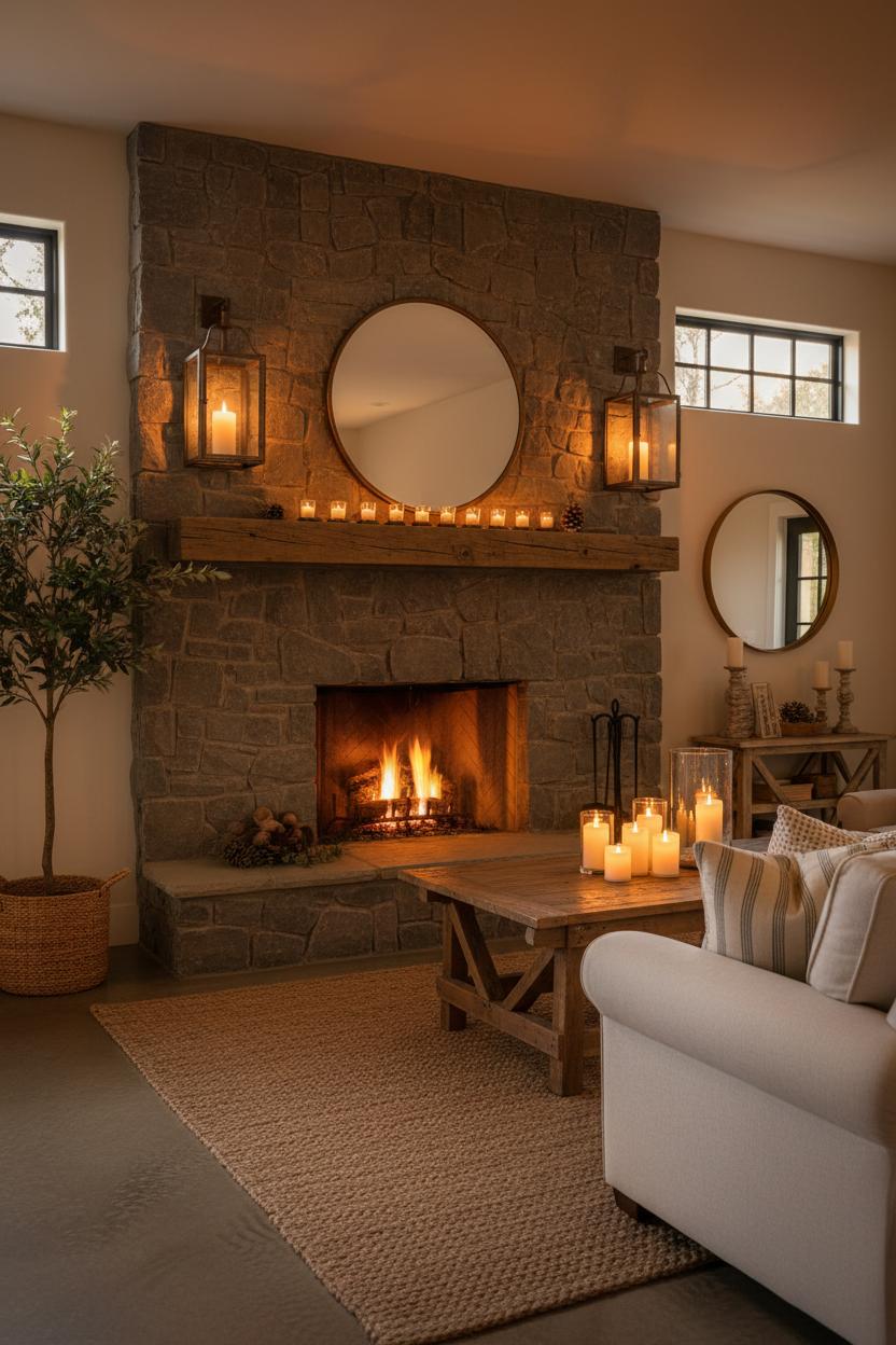 Stone has a way of grounding a space and telling a quiet, earthy story, which is why it’s the perfect companion to warm woods in rustic home decor. Start with the hearth: picture a fireplace wrapped in stacked ledgestone or rounded river rock, finished with a chunky reclaimed beam as a mantel. That mix of raw texture and timeworn wood instantly gives off cabin interior vibes, even if you’re miles from the mountains. In a cozy living room, let the stone do the talking while you layer in softness—think a jute area rug underfoot, a reclaimed wood coffee table with a live-edge feel, and a tumble of farmhouse throw pillows in nubby linens and plaids. Flank the surround with lantern sconces for a golden, flickering glow that kisses the stone’s edges at night. A tall faux olive tree in a woven basket slips in a hint of green without competing, and its silvery leaves echo the cool notes found in slate and soapstone. For extra charm, tuck a small wood niche beside the hearth; the stacked logs become art and add to the scent-and-sight ritual that makes farmhouse style so inviting.