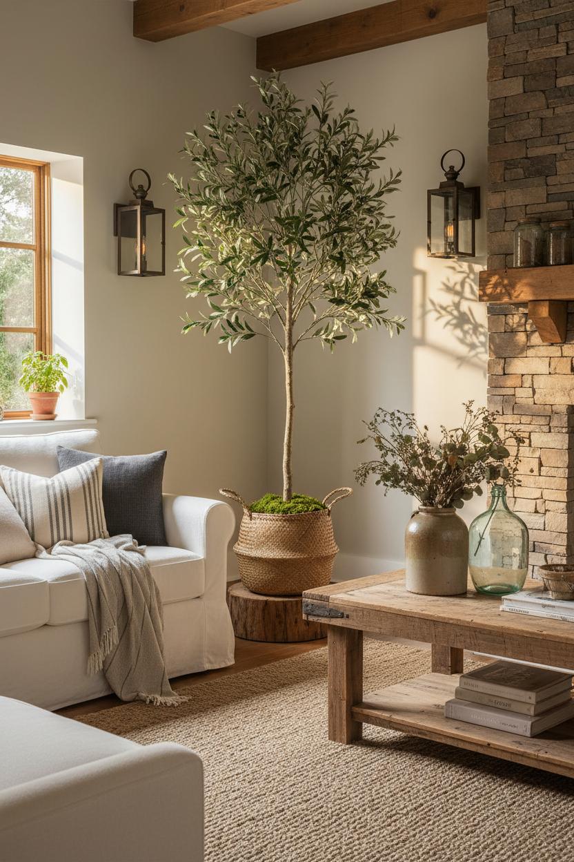 Placement is everything. Slide your olive tree into a sun-kissed corner beside a reclaimed wood coffee table and let the grain tell its story; the contrast of lively green against timeworn wood is magic. Anchor the scene with a jute area rug for that barefoot-friendly texture, and scatter farmhouse throw pillows on the sofa in muted stripes, creams, and charcoal to echo the tree’s soft, silvery leaves. In the evening, lantern sconces cast the prettiest glow across the branches, creating the gentle shadows you’d find in a cabin interior at twilight. This is farmhouse style at its coziest—unfussy, layered, and inviting, with nature’s palette doing the heavy lifting.