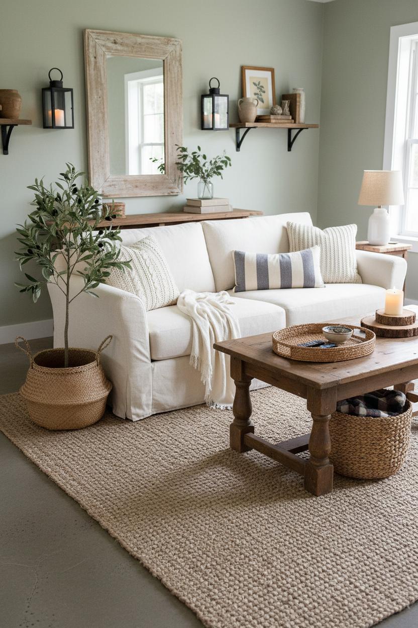 When you’re craving that instant, lived-in charm, start with texture swaps that deliver big warmth for little cash. Roll out a jute area rug to ground the room with nubby, sandy color, then layer in farmhouse throw pillows—mix chunky knits with subtle stripes or ticking for that relaxed farmhouse style without trying too hard. If your sofa feels tired, a soft cotton throw and a couple of oversized pillows can fake a fresh seat in minutes. Corral remotes in a woven tray, tuck a plaid blanket into a basket, and set a small faux olive tree in a belly basket for a hit of organic green that never wilts. These simple touches make a cozy living room feel curated and calm, the essence of rustic home decor.