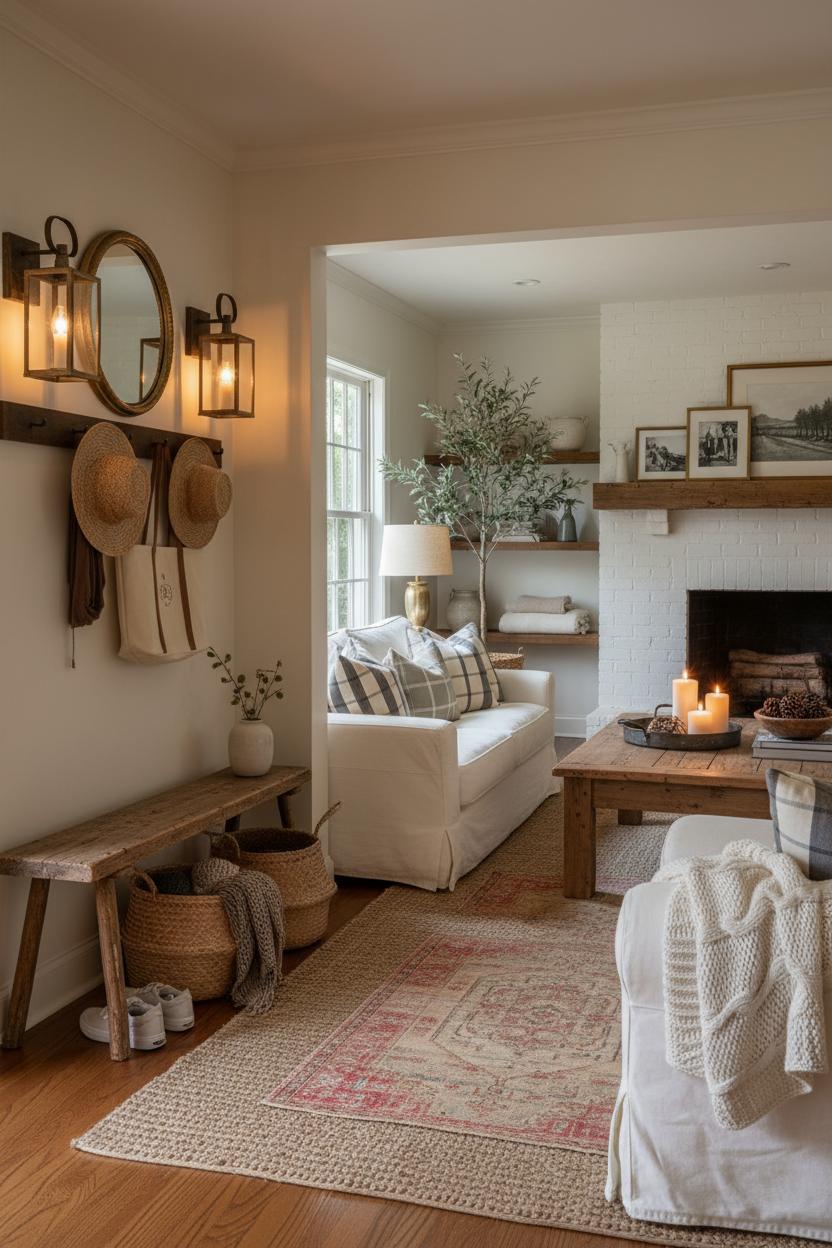 Step inside and let texture do the talking. A warm welcome in a rustic home decor scheme starts at the entry: think a slim bench with timeworn wood grain, a stack of woven baskets for scarves and shoes, and a soft landing underfoot with a layered rug moment—start with a chunky jute area rug and top it with a vintage-look runner. Flank a distressed mirror with lantern sconces to throw gentle, flickering light across nubby knits and matte pottery, and you’ve set the tone for that inviting farmhouse style glow before guests even glimpse the rest of the house. Add a simple peg rail for straw hats and market totes, and you’ve got function wrapped in charm, the perfect bridge between easy country living and a more polished, collected look.