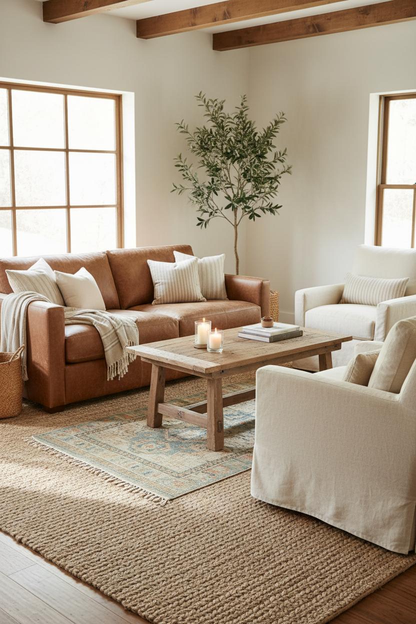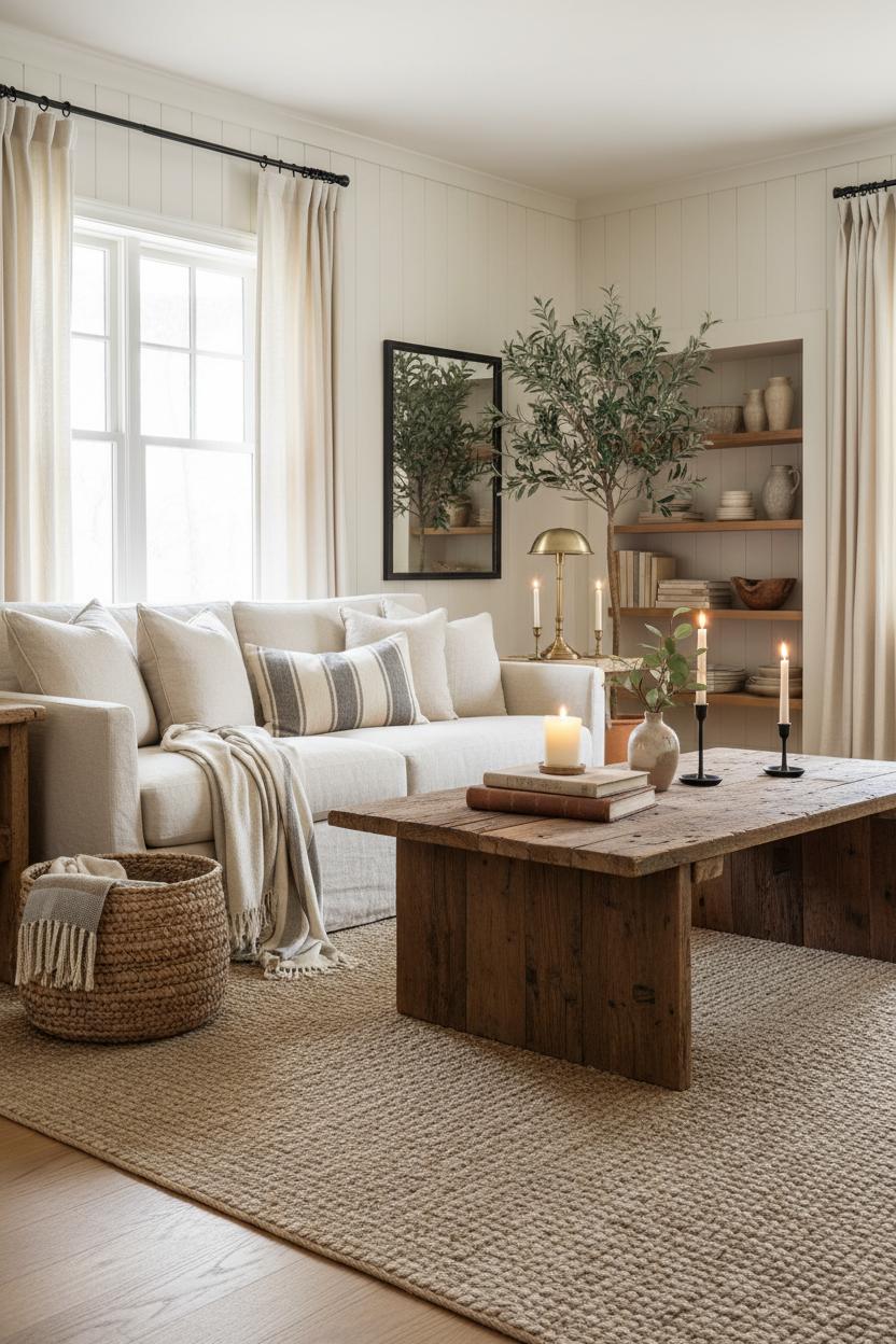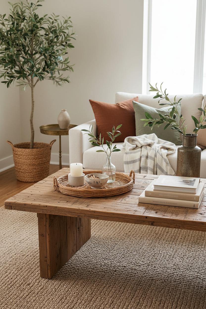 Layer the rest of the seating area to echo what’s happening on the tabletop. Underfoot, a chunky jute area rug adds nubby texture and makes the whole vignette feel anchored and intentional. On the sofa, switch in linen throw pillow covers in soft, earthy tones and drape a neutral striped throw blanket for cozy contrast and a hint of pattern. These tactile touches keep the palette calm while letting the table’s character take center stage—one of the easiest cozy home ideas to pull off. For height, place a larger floor vessel or basket nearby and style it with olive branches to repeat the greenery, or let a nearby faux olive tree frame the scene without competing. Mix finishes subtly—aged brass, iron, and hand-thrown ceramics—to bridge farmhouse decor with a clean, modern rustic sensibility. As you style, think layers of height (low candle, medium book stack, taller stems), play with odd numbers, and swap in seasonal sprigs when you want a refresh. The result is a coffee table that feels welcoming and collected, equal parts practical and pretty—exactly what a rustic living room should be.