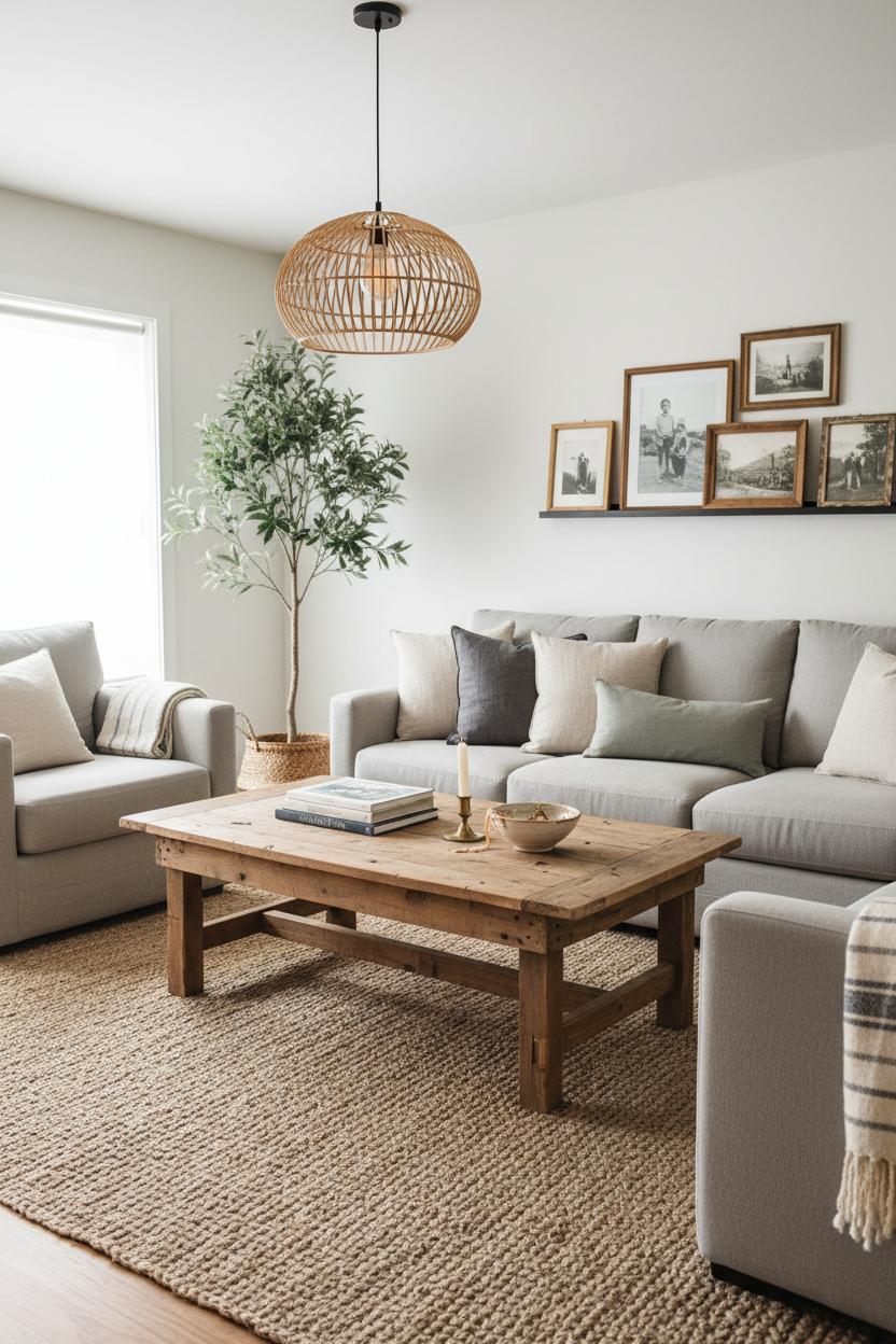 Next, consider a furniture and greenery glow-up. Swapping a glossy piece for a reclaimed wood coffee table instantly adds character, depth, and that coveted timeworn patina. Style it simply: a low stack of books, a ceramic bowl, and a thrifted brass candlestick. Then bring the outdoors in with a faux olive tree tucked into a woven basket—its silvery leaves soften corners and make a rustic living room feel grounded year-round. Update lighting by swapping in warm-toned bulbs and a linen or rattan shade to mellow the mood. Even small hardware tweaks—matte black pulls on a media console or a vintage-inspired knob on a cabinet—can nudge your farmhouse decor toward custom. Finally, rethink your art: print black-and-white family photos or vintage landscapes at home and pop them into thrifted frames for an instant gallery ledge. With a few thoughtful changes like these, your space will feel layered and welcoming, proof that modern rustic charm doesn’t require a remodel—just smart, soulful swaps that make a big impact.