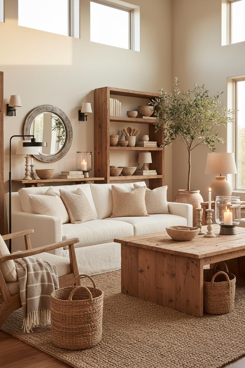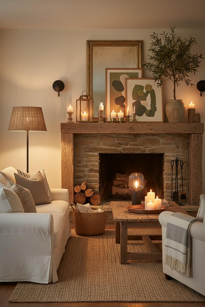 Let the fireplace be your star. Treat the mantel like a still-life: lean a vintage-style mirror to bounce light, stack art in muted tones, and add a spriggy faux olive tree in a rustic pot to bring in greenery without the maintenance. Keep kindling and split logs neatly stacked to one side, and introduce contrast with wrought-iron tools or matte-black lanterns for that modern rustic edge. A low, rugged reclaimed wood coffee table anchors the seating area, while the jute area rug ties the vignette together. With thoughtful lighting, layered candles, and a styled hearth, your rustic living room becomes a warm, welcoming retreat that nails both timeless farmhouse decor and today’s cozy, collected vibe.