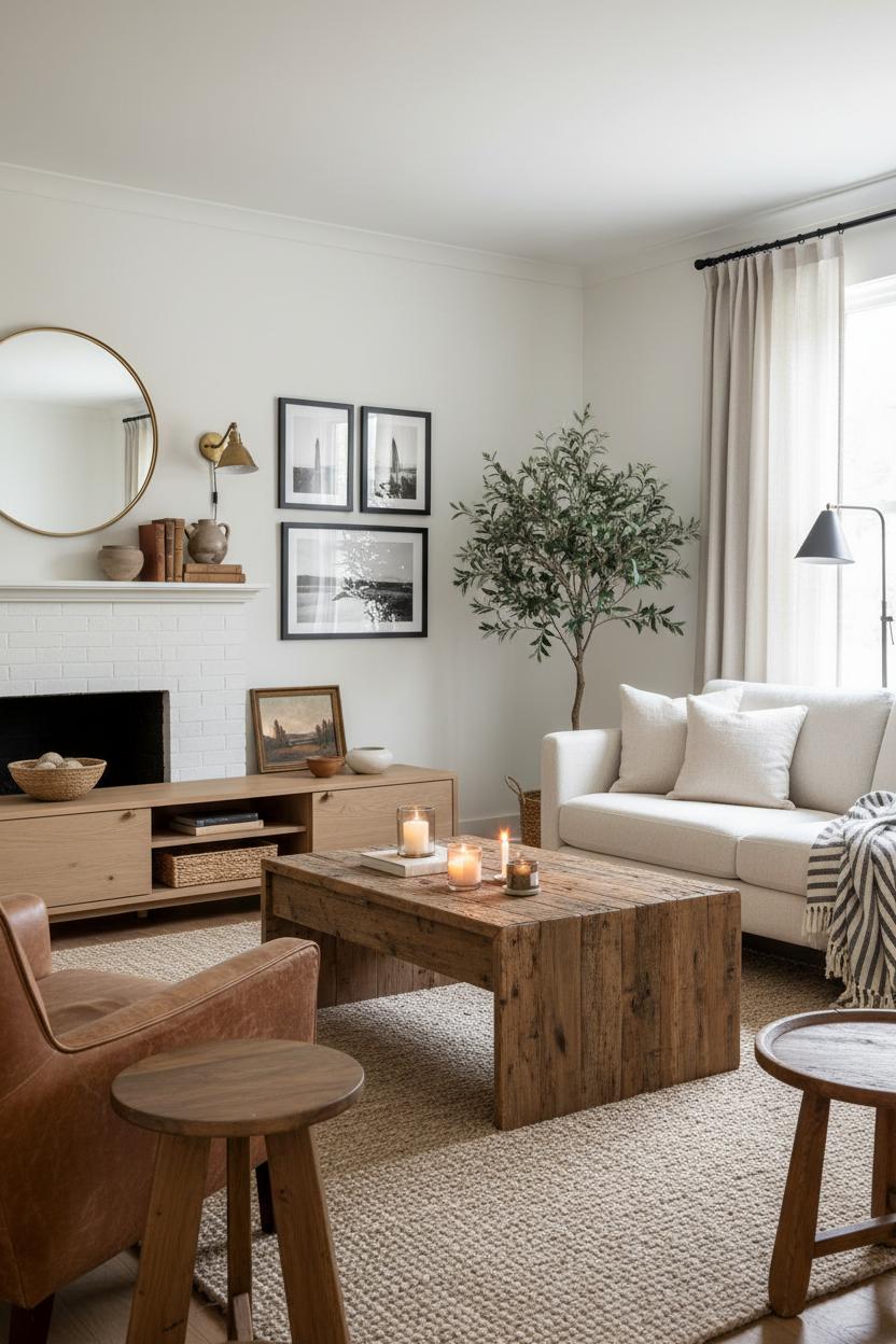 Now weave in the cozy. Swap seasonal color punches for texture-on-texture: linen throw pillow covers that feel breezy and timeless, a neutral striped throw blanket draped casually for effortless hospitality, and a cluster of handmade stoneware on the mantel. Tuck a faux olive tree in the corner for vertical softness and an organic note that doesn’t demand a green thumb. Style shelves with a few vintage books, a small landscape painting, and a woven basket to nod to farmhouse decor without going theme-y. In a rustic living room, lighting matters—think warm bulbs, a shaded sconce, and candlelight to highlight wood grain and subtle nubby fabrics. If you’re tempted to add more, edit instead: repeat finishes (black, brass, and wood), echo shapes (round bowl, round mirror), and let one or two aged pieces—like that coffee table or a leather accent chair—carry the history. The result is a curated, relaxed mix that feels collected over time and checks every box for cozy home ideas while staying firmly rooted in modern simplicity.