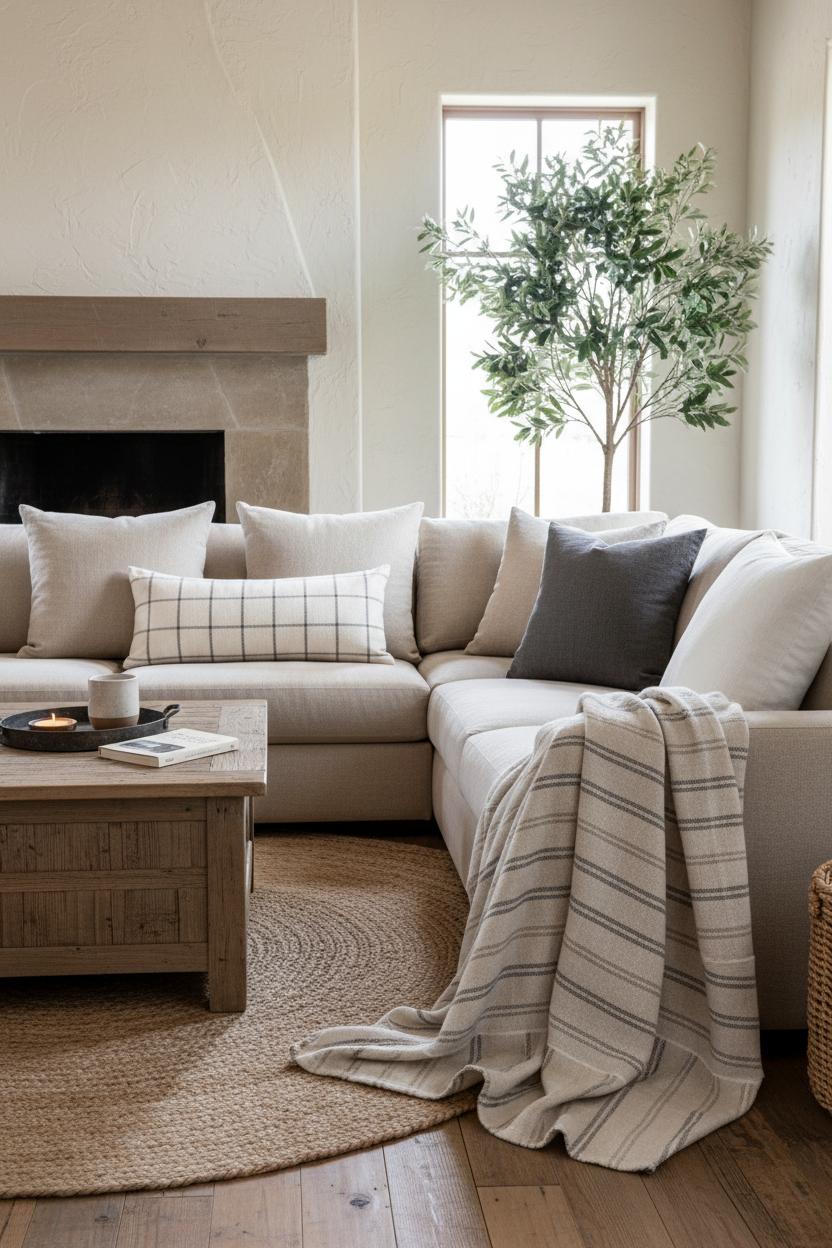 Now add the coziest finishing touch: a neutral striped throw blanket you can pull around your shoulders at dusk. Drape it loosely over the sofa arm, fold it at the foot of a chair, or tumble it into a woven basket for an effortless, Pinterest-ready look that still feels completely usable. Those slim, tonal stripes add dimension the way good jewelry completes an outfit, especially when paired with a jute area rug underfoot and the grain of a reclaimed wood coffee table. The combination is pure farmhouse decor meets city polish: tactile, unfussy, and irresistibly touchable. To round out the vignette, layer a tray with a candle and a dog-eared book, then tuck a faux olive tree in the corner for height and an earthy, Mediterranean note that blends seamlessly with cozy home ideas.