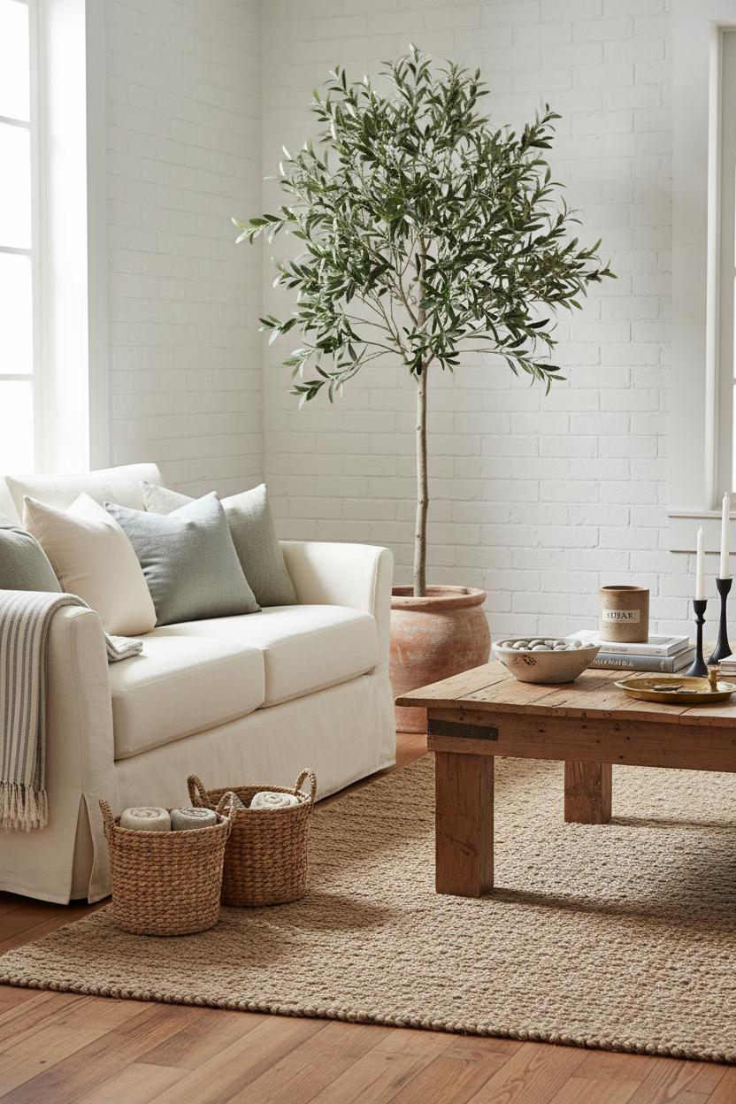 Nothing freshens a rustic living room quite like a touch of green, and a tall faux olive tree is the easiest way to bring that breezy, Mediterranean vibe indoors without the upkeep. Tuck one into a weathered clay pot or woven basket and let those soft, silvery leaves frame a sunny corner or flank the sofa. The organic silhouette instantly softens straight lines and adds height, which is a simple trick in rustic interior design to make a space feel layered and lived in. Ground the scene with a chunky jute area rug that introduces earthy texture underfoot, then echo those natural fibers with a couple of baskets for throws and remotes. Think of it as the modern rustic version of a houseplant moment—quiet, textural, and totally effortless.