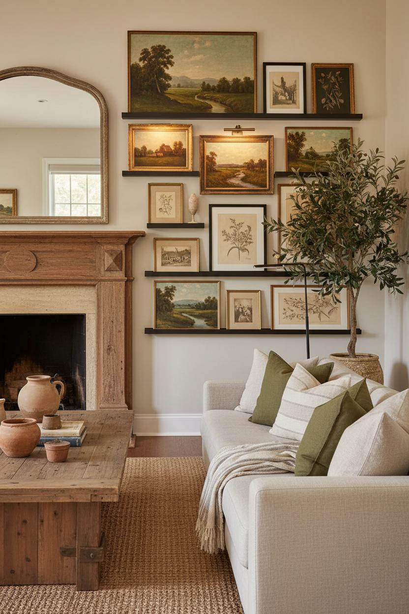 Introduce a rustic mirror to bounce light around and deepen the patina of the space—an aged brass oval above the mantel, or a weathered wood arch that echoes old cottage windows. Mirrors opposite a window will double the glow on nearby textures, from a jute area rug under a reclaimed wood coffee table to the silvery leaves of a faux olive tree in the corner. Keep those gallery ledges functional and beautiful: mix oil paintings with sepia family photos, charcoal sketches, and even pressed botanicals in slender frames. Vary heights and overlap edges to add depth, and try a picture light or two for that golden-hour gallery vibe long after sunset.