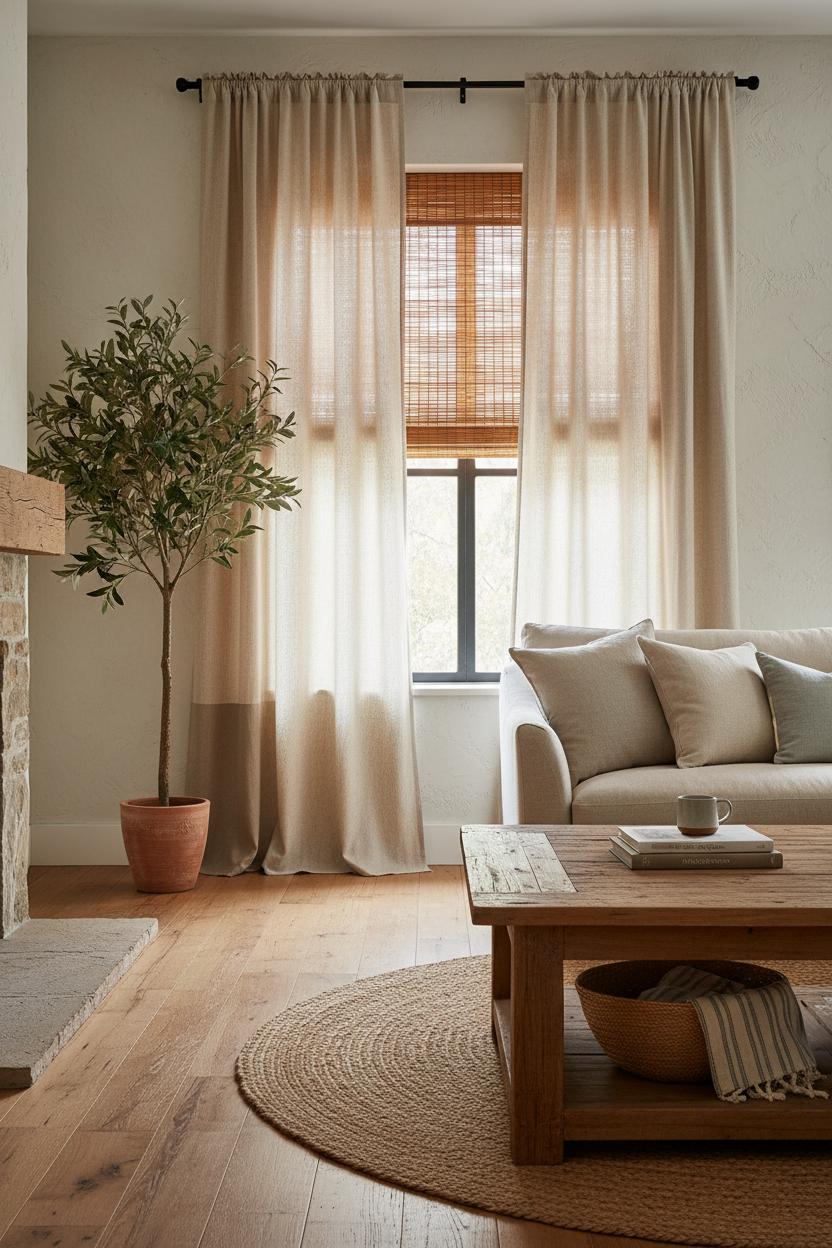 To pull the whole vignette together, echo those textures around the windows and below them. A jute area rug grounds the space and riffs off the basketweave of the shades, while a reclaimed wood coffee table introduces weight and timeworn character. Pile on linen throw pillow covers and a neutral striped throw blanket to repeat that breezy softness across the room, and tuck a faux olive tree in the corner to frame the curtains with a little organic movement. Keep hardware minimal—matte black or aged brass rings and brackets—and consider banding the curtain edges in a darker flax for subtle contrast. If you need more light control, add a privacy or blackout liner to the shades without losing the natural look. These window treatments are one of those cozy home ideas that instantly elevate a space: in the morning, they filter sunlight like a warm whisper; at night, they cocoon the room in texture and calm. The result is a rustic living room that feels sun-washed, layered, and endlessly inviting.