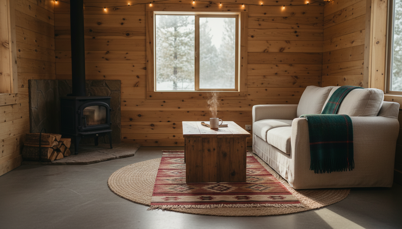 When the temperature dips, the quickest way to cozy up small cabin interiors is to layer tactile, natural materials that invite you to linger. Start with a wool throw blanket—thick, fringe-tipped, and casually draped over a bench or the arm of a petite sofa—then build on that soft foundation with a nubby pillow, a shearling seat pad, and a linen-covered cushion. The mix of textures feels like a hug, and it’s the heart of rustic decor done right. Keep your palette simple to channel that Scandinavian cabin calm: oat and cream, a hit of charcoal, maybe a whisper of forest green. Anchor the room with a reclaimed wood coffee table, its knots and grain telling the story of seasons past, and let pools of warm light gather around it with an LED lantern on the tabletop. Tuck a cabin scented candle nearby for the gentle scent of fir and smoke; even unlit, it completes the moment and grounds your cozy cabin ideas in all the senses.