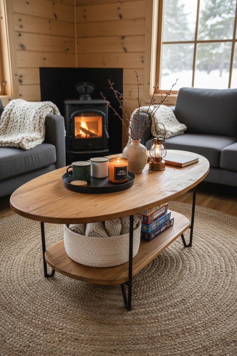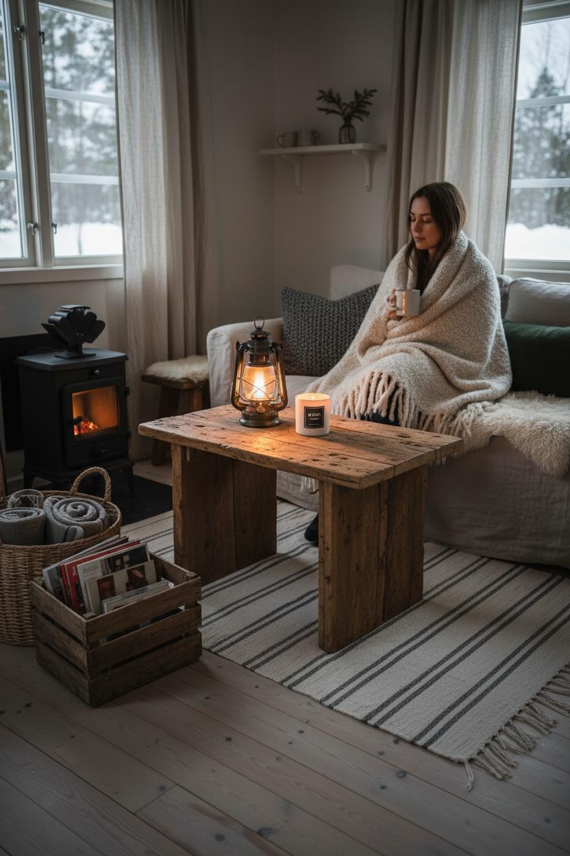 Style it like a small campfire for the senses. A simple tray corrals enamel mugs and coasters beside a cabin scented candle that smells like cedar and smoke; after dusk, switch on a petite LED lantern for that cozy flicker without the fuss. A low stoneware vase with foraged branches keeps the look unfussy, and a folded deck of trail maps or a well-thumbed field guide adds quiet character. Nearby, drape a wool throw blanket over the arm of the sofa so texture echoes the table’s grain, and let the gentle whir of a wood stove fan by the fire carry warmth to this little hub. Keep the surface curated—three to five pieces in varied heights—so it stays functional for board games and feet-up movie nights. The beauty of a reclaimed wood coffee table is how it bridges indoors and out, making your favorite cozy cabin ideas feel collected rather than decorated, and turning even the smallest sitting area into the heart of home.