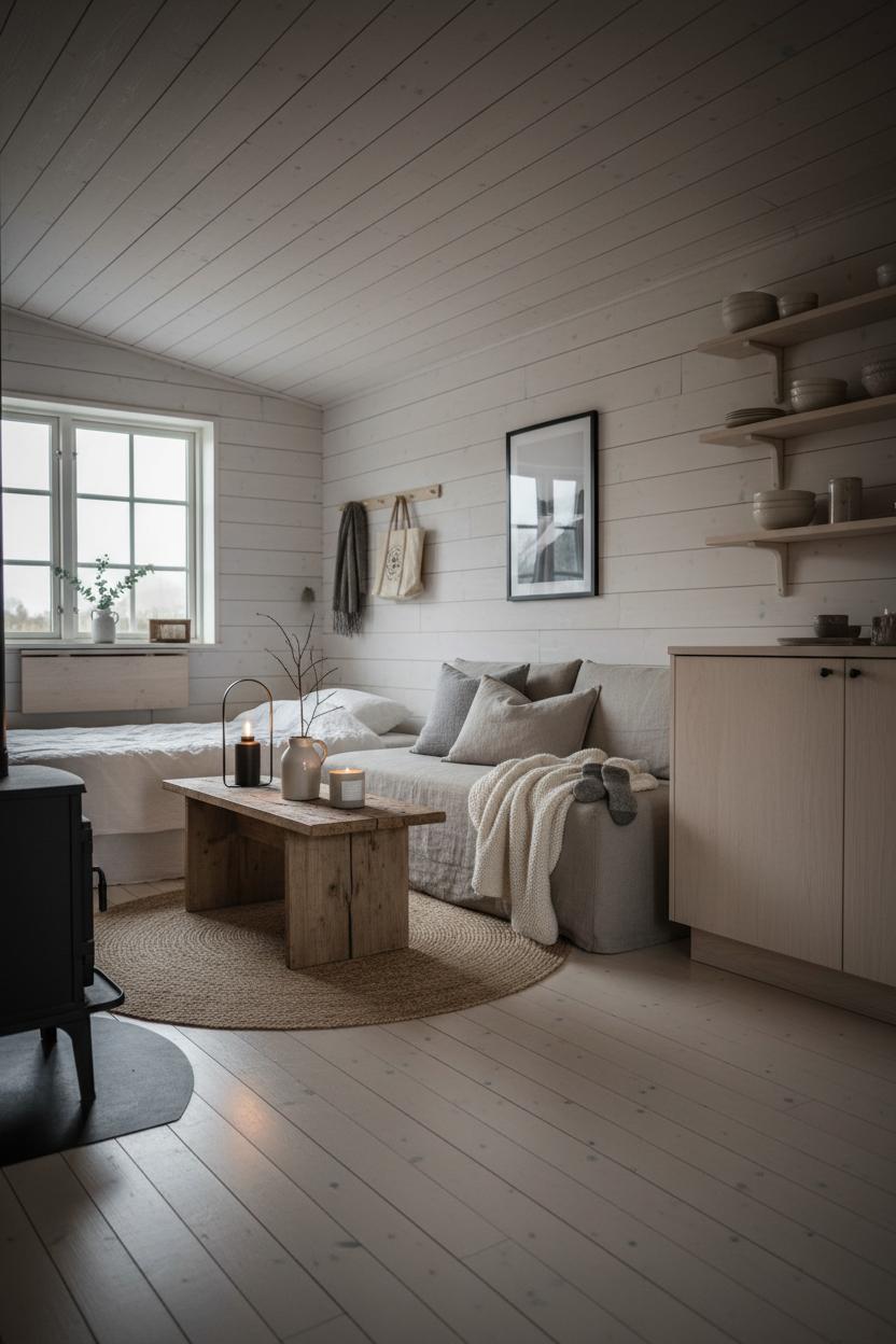 Function is just as beautiful as form here. Built-in benches with hidden storage, peg rails for everyday essentials, and a narrow dining perch that folds down when not in use keep clutter low and the mood high. If you’ve got a compact stove, a quiet wood stove fan helps circulate warmth without adding visual noise—so the room stays toasty while the look stays minimal. Finish with nature-forward accents that still feel refined: a branchy stem in a ceramic jug, a cabin scented candle that smells like cedar and smoke, a simple landscape print in a thin black frame. A sprig of eucalyptus on the nightstand, wool socks tossed casually over the arm of the sofa, and that LED lantern flickering at dusk all lean into rustic decor without sacrificing serenity. Stick to three or four hues across textiles and wood tones to keep cohesion, and let patina do the storytelling. In a Scandinavian cabin, small gestures make the biggest impact—and every pared-back choice turns small cabin interiors into a soft, slow sanctuary you’ll love coming home to.