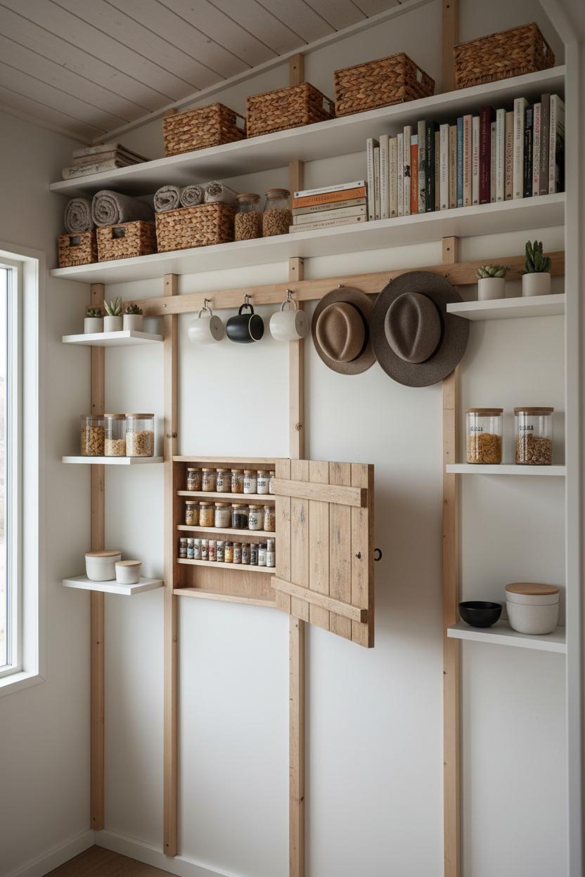 Choose furniture with hidden depths. A window bench with drawers cradles linens while making a snug reading nook; a platform bed swallows off-season gear in deep drawers; even your steps can be clever, with riser cubbies for slippers or board games. Consider a reclaimed wood coffee table with a lift-top or shelf—handsome enough to anchor rustic decor, practical enough to stash remotes, maps, and a deck of cards. Ladder-style racks display a wool throw blanket or two within arm’s reach, freeing up closet space and adding that layered, cozy look you crave. In the kitchen corner, a magnetic knife strip, a rail for mugs, and a slide-out pantry keep counters airy, while lidded baskets hide snacks and dog gear. Narrow spaces love slim cabinets; empty corners love nesting stools that stack until guests arrive.
