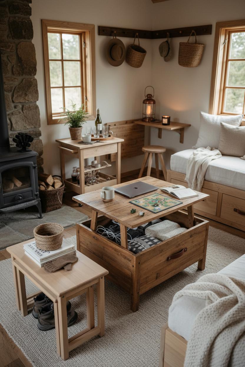 When square footage is precious, every piece in small cabin interiors should have a day job and a side hustle. Think smart silhouettes with secret storage, flexible footprints, and materials that add soul to your rustic decor. A lift-top reclaimed wood coffee table becomes a laptop perch at breakfast and a board-game nook at night, while hiding cords and throws beneath; a slim storage bench by the door corrals boots and mittens, then slides over to the hearth for extra seating when friends drop by. Fold-down wall tables feel delightfully old-school and are perfect for tiny home living—flip them up for supper, tuck them away for morning yoga. Nesting tables moonlight as nightstands, plant stands, and snack stations. If you love a light, airy look, borrow from a Scandinavian cabin palette: pale woods, linen cushions, and clean lines that visually open the room while still working hard. A daybed with deep drawers doubles as a sofa; add a wool throw blanket for texture and instant coziness. Even vertical space pulls its weight—peg rails display baskets, lanterns, and hats, freeing surfaces without sacrificing charm.