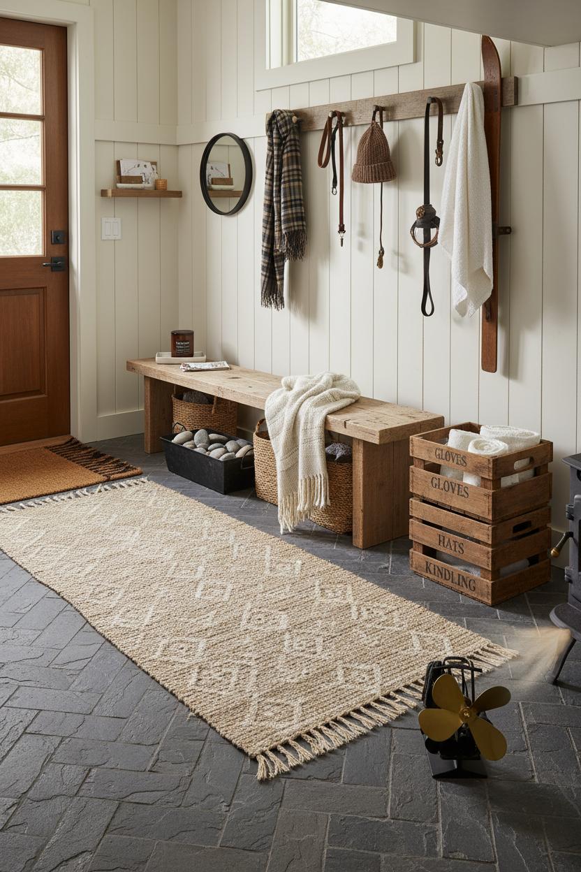 The entryway is where small cabin interiors really earn their keep—muddy boots, dripping parkas, and that daily shuffle in and out all need a warm welcome that’s also no-nonsense. Start from the ground up with a layered rug strategy: a coir mat outside to knock off the grit, and a washable runner inside to catch the rest. Tuck a galvanized boot tray under a slim bench and line it with smooth river stones so slush drains and soles dry quickly. If you can swing it, slate or brick in a herringbone pattern makes a handsome, hardwearing floor that nods to rustic decor while standing up to puddles. On the walls, beadboard or shiplap painted creamy white brightens dark corners and wipes clean; a sturdy peg rail runs the length of the zone so every scarf, hat, and dog leash has a hook.