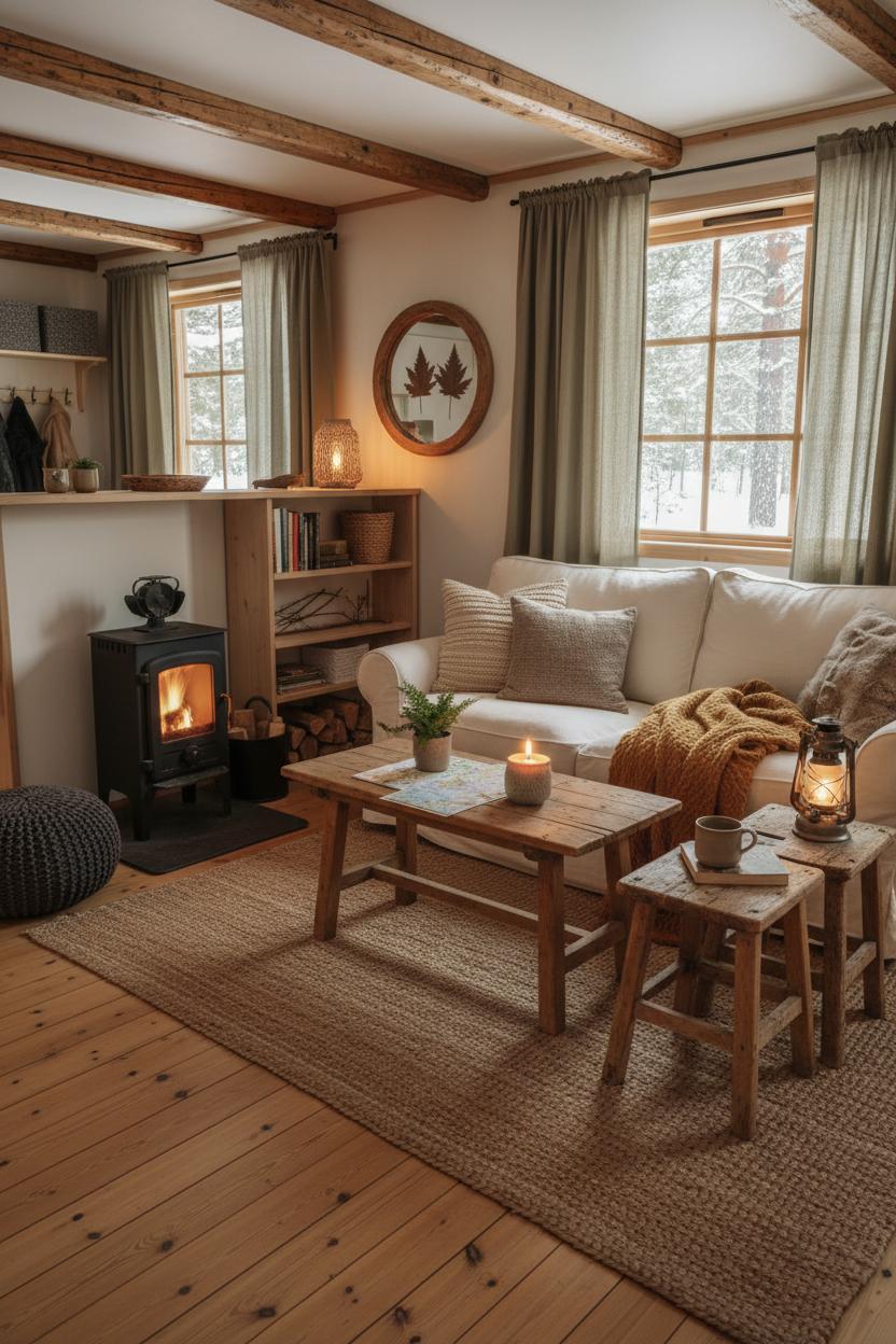 Warmth is more than a look—it’s a system—so if you’re lucky enough to have a tiny stove, a compact wood stove fan can quietly push heat into every corner, making tiny home living feel generous and snug. Corral extra blankets in a woven basket, stack magazines in a vintage crate, and float a simple shelf over the sofa for easy-to-reach mugs and a tiny vase of pine. This is the magic of Scandinavian cabin style: fewer things, better chosen, with textures doing the heavy lifting. Layer a flatweave rug over bare boards to define the seating zone without crowding it, and pull curtains in a soft, slubby fabric to blur the line between window and wall. At day’s end, toss the wool throw blanket over your shoulders, switch on that amber-glowing LED lantern, and let the reclaimed wood coffee table catch the flicker while the cabin scented candle whispers of cedar trails. In a room this considered and calm, every layer warms you twice—once by touch, and again by the mood it creates.