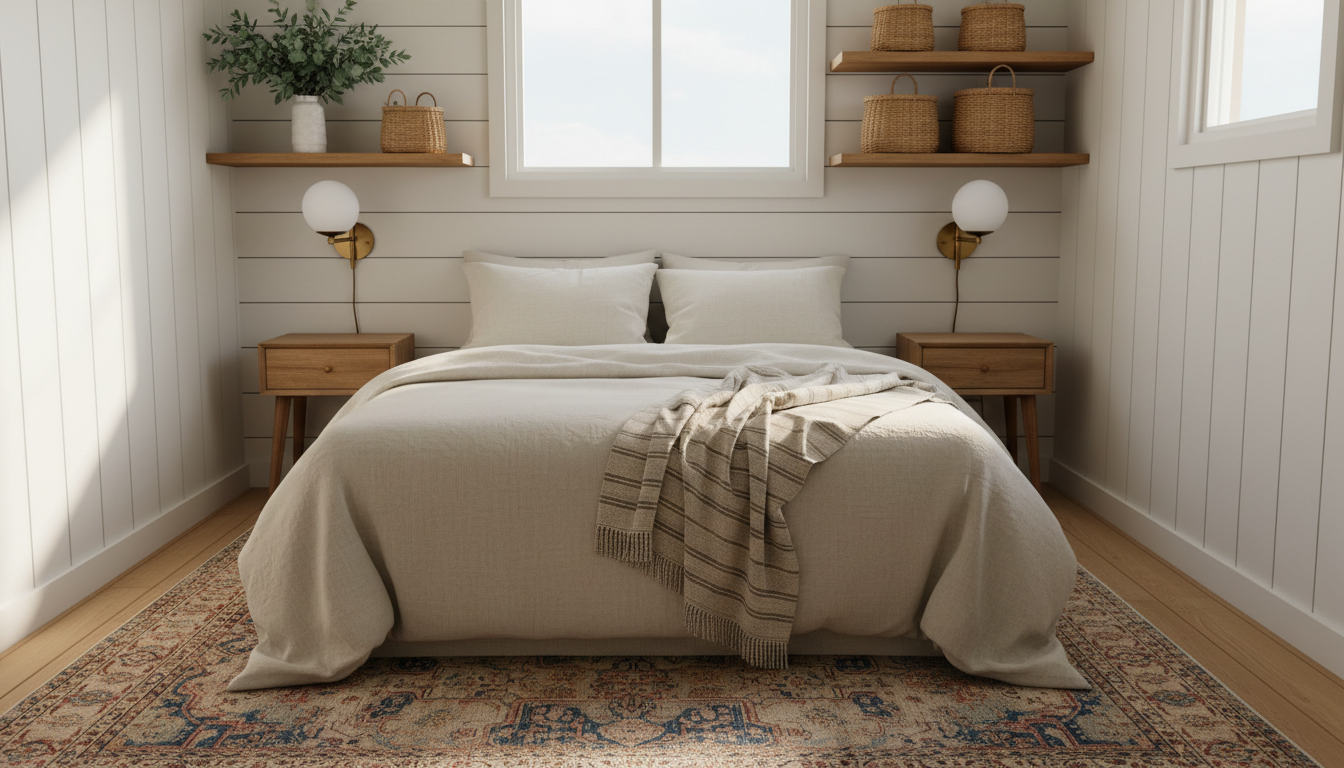 For beds, an iron frame is a tiny-room hero. Its slim silhouette and open rails keep sightlines clear so your square footage feels bigger, and the raised profile is perfect for hidden storage. Slide a pair of tidy underbed storage bins below to tuck away off-season sweaters or spare linens—no bulky dresser required. To free up nightstand space, mount plug-in wall sconces on either side of the shiplap wall; they add a vintage note and bring light exactly where you need it for late-night reading. A soft, low-pile vintage area rug underfoot ties everything together, grounding the room with age-worn pattern and color while insulating against chilly floors. This is small space design that’s equal parts practical and pretty, the essence of cozy bedroom ideas that feel effortless.