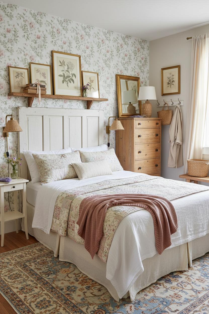 Once the bed is placed, climb the walls—visually, that is. Mount plug-in wall sconces so your nightstands stay clear, and add a slim picture ledge or peg rail above for books, glasses, and a sprig of greenery. Mirrors opposite a window bounce light and make low ceilings feel taller. Ground the room with a soft vintage area rug that extends beyond the bed to widen the footprint, then layer breathable textures on top: a linen duvet cover, washed cotton sheets, and a nubby throw to invite nap-time. Keep your palette soft and collected—chalky whites, weathered woods, a whisper of sage—and weave in cottagecore decor with floral prints, scalloped edges, and handmade pottery. Corral everyday clutter with woven storage baskets on open shelves, and slide underbed storage bins beneath the frame to tuck away off-season quilts and sweaters without stealing closet space.