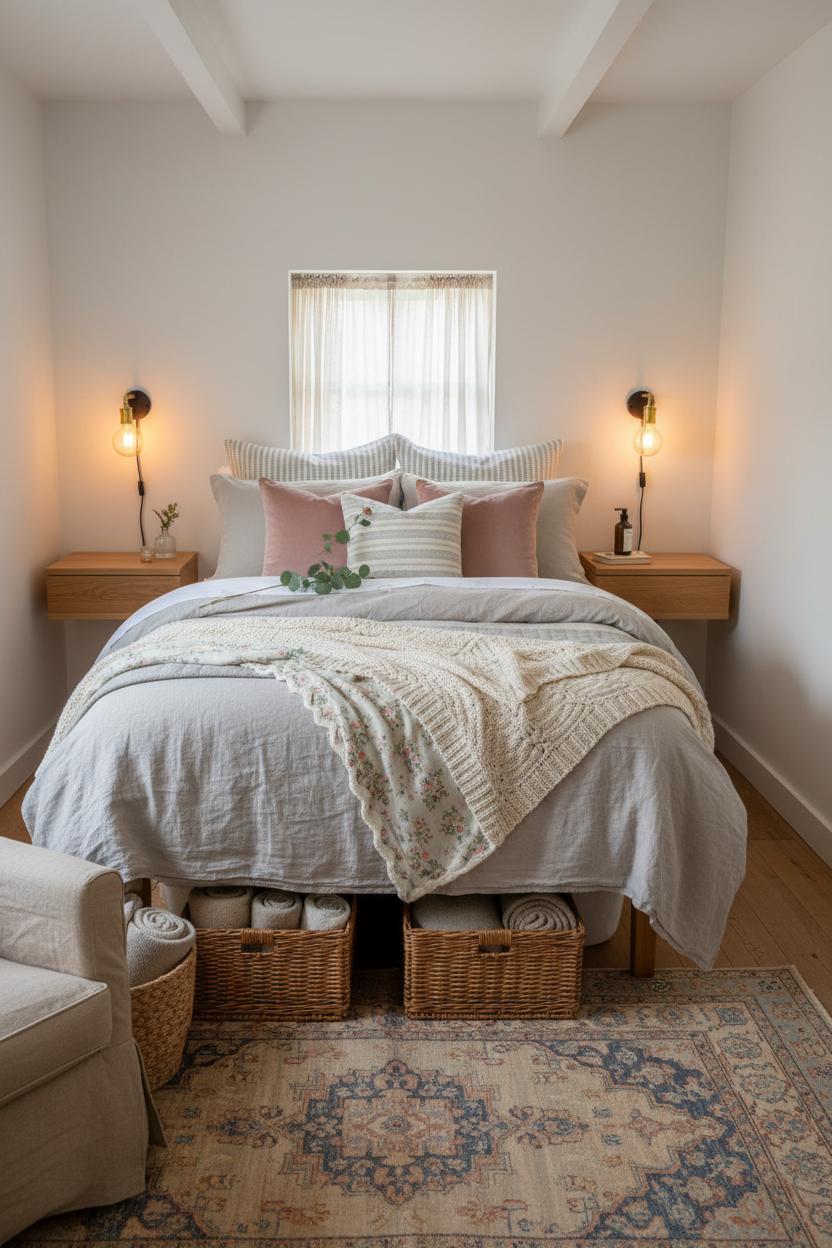 Think about atmosphere and function together, the heart of good small space design. Swap bulky table lamps for plug-in wall sconces so the nightstands feel open and airy; warm bulbs cast that candlelit glow that makes textures on the duvet and throws look extra inviting. Underfoot, slide in a vintage area rug that extends at least 18 inches beyond each side of the bed—its timeworn pattern grounds the room and cleverly hides scuffs, making the footprint feel larger. Keep the extra layers you’re not using close at hand but out of sight with underbed storage bins; tuck in seasonal blankets, spare pillowcases, and even your off-rotation quilt with a sachet of lavender. Corral nightly essentials and rolled throws in woven storage baskets beside a chair or at the end of the bed for a pretty, practical moment that still reads tidy.