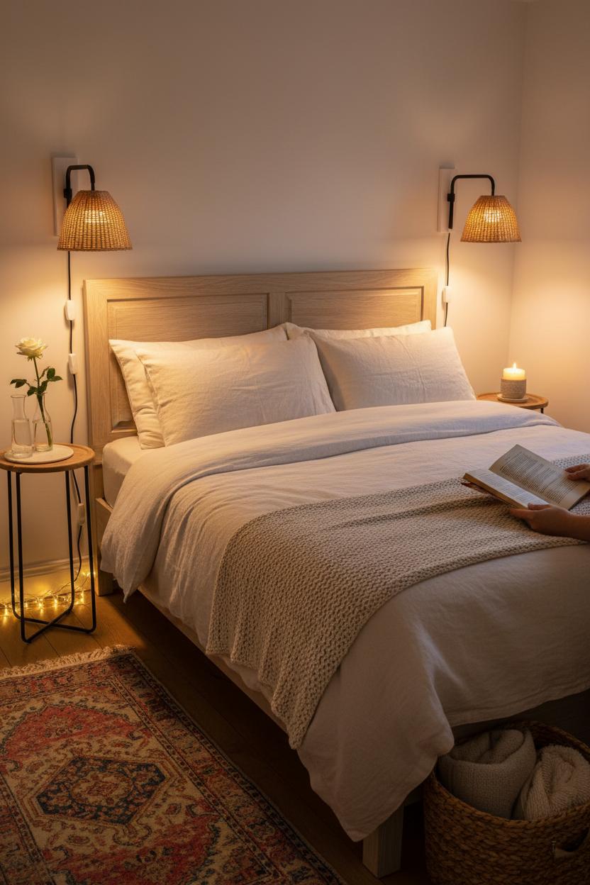 A few styling tricks make them look intentional. Hang sconces roughly at seated shoulder height so the light hits your book, not your eyes; if they’re adjustable, offset one slightly lower for layered ambience. Disguise cords with paintable cord covers, or tuck them neatly behind framed art, down the bed frame, or along baseboards with clear clips—quick, renter-friendly, and tidy. Keep the now-freed nightstand minimal: a slim carafe, a single bud vase, a favorite candle. Stash everything else in woven storage baskets by the bed or slide underbed storage bins out of sight, so the glow feels calm and uncluttered. For extra sparkle, let the sconces do the heavy lifting and sprinkle in a tiny string of fairy lights or a flickering candle for depth. It’s one of the easiest cozy bedroom ideas to implement—high on charm, low on effort—and it instantly makes a petite room feel intentional, layered, and ready for slow mornings and early lights-out.