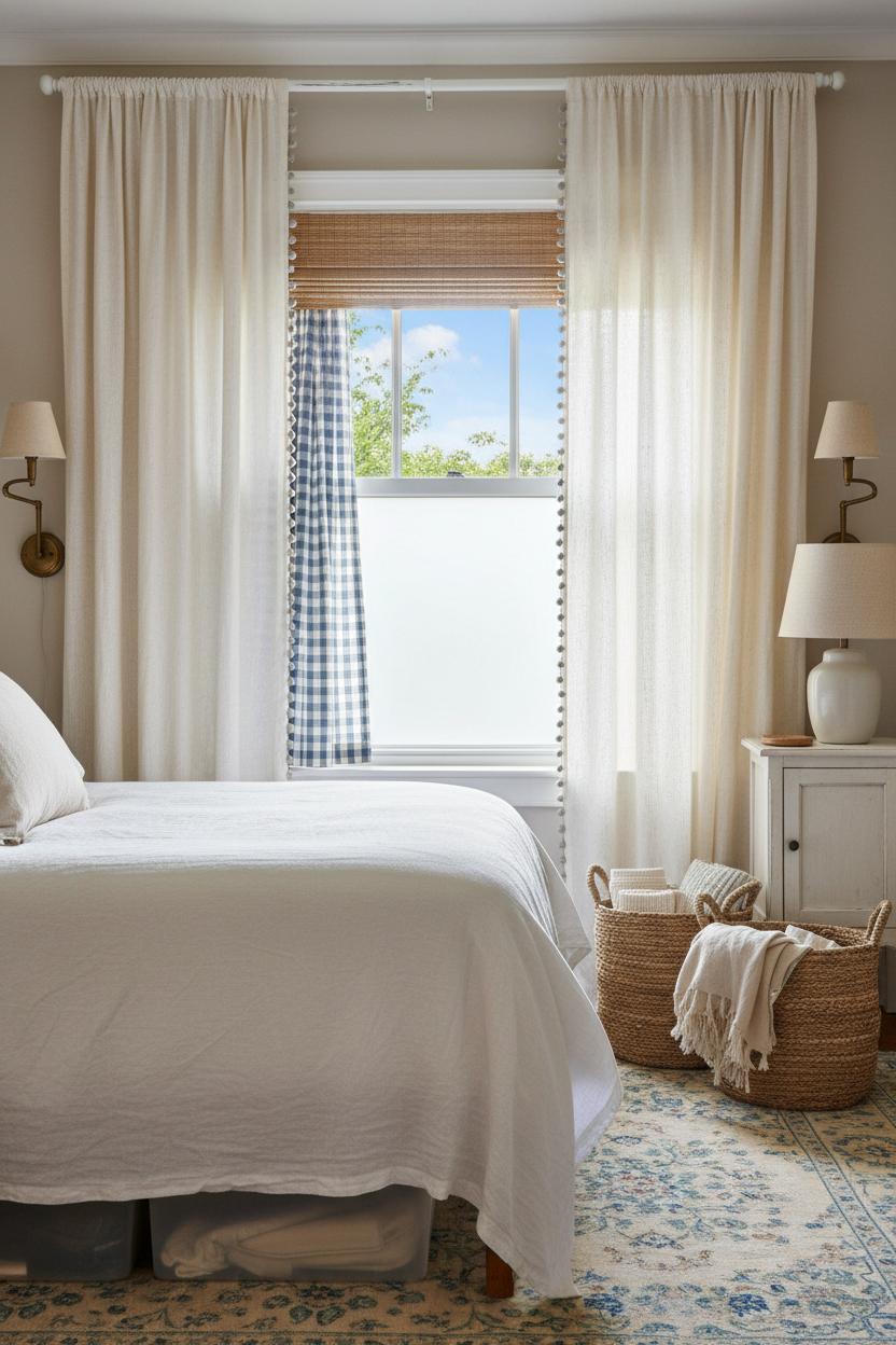Think about function, too. Roman shades free up the sides of the window so they won’t compete with plug-in wall sconces or a petite nightstand. Café curtains on the lower half are a sweet solution for street-facing windows, keeping the room private while letting sky and treetops pour in. For day-to-night ease, top-down/bottom-up shades are genius—sunlight above, privacy below. Frosted privacy film on the lower panes is another renter-friendly, discreet helper. Keep the palette cohesive with a linen duvet cover and let a vintage area rug ground all the softness underfoot. Tuck extra panels and seasonal throws into woven storage baskets or slide them into underbed storage bins so sills stay clutter-free and the room breathes. With a few well-chosen layers, your small cottage bedroom becomes a light-washed retreat: airy by day, cocooned at night—cozy bedroom ideas that feel fresh, pretty, and perfectly at home.