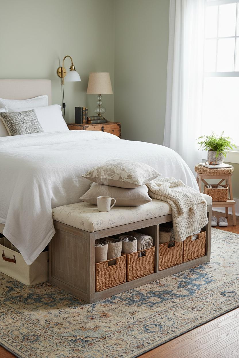 Trunks carry the same double-duty magic: an old pine or painted vintage trunk can moonlight as a nightstand or coffee-table-at-the-foot-of-the-bed, offering a sturdy surface for a lamp and a stack of books while hiding bulky sweaters, blankets, or guest bedding inside. Layer a vintage area rug beneath to ground the vignette and soften creaky floors. Don’t overlook stools, either—nesting stools slide under one another when not in use, and a petite, lidded storage stool can hold slippers or bedtime reading while standing in as a side table. A simple step stool pulls triple duty as plant perch, bedtime table, and helper for top-shelf baskets. For overflow, slim underbed storage bins keep off-season clothing out of sight without stealing closet space. These cozy bedroom ideas work best when you repeat textures—washed wood, woven fibers, nubby linen—so the room reads collected rather than crowded. With a few smart, multi-tasking pieces, your small cottage bedroom feels bigger, calmer, and beautifully lived-in.