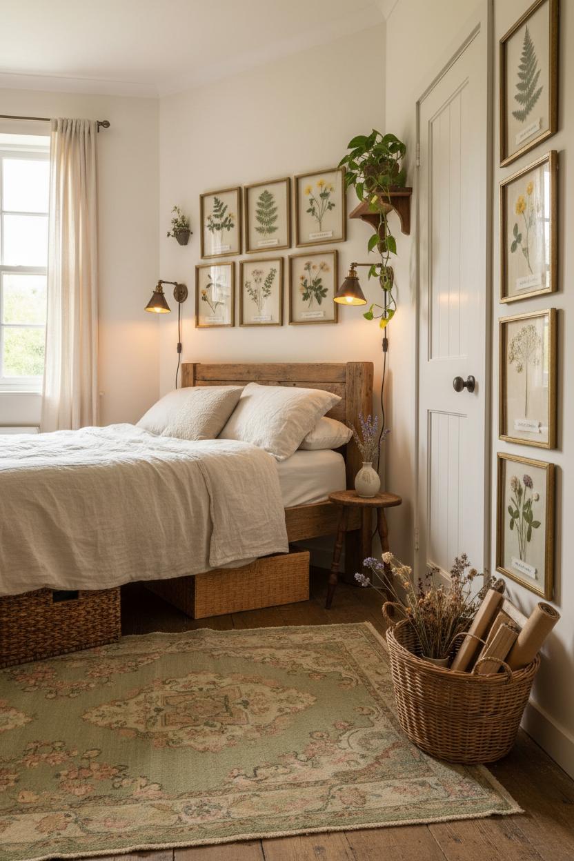 Layering textures keeps the vignette from feeling fragile. A rumpled linen duvet cover, a faintly faded vintage area rug, and a sprig of dried lavender in a bud vase echo the organic lines of the pressed pieces. Tuck a few trailing plants on shelves to mix live greenery with your preserved finds; the contrast feels fresh and endlessly cozy. Keep supplies—extra frames, washi tape, flower press—in underbed storage bins so projects don’t spill into your routine, and corral seasonal stems in woven storage baskets at the foot of the bed. Color-wise, let the botanicals set the palette: soft sage, muted blush, and creamy butter pair beautifully with warm wood and iron. It’s one of those cozy bedroom ideas that looks effortlessly custom, costs little, and scales with your space—swap in new blooms as the seasons change, or expand the gallery as you collect. In a small cottage bedroom, these tiny moments of nature turn the walls into windows, inviting the outside in and making every morning feel like a quiet walk through the garden.