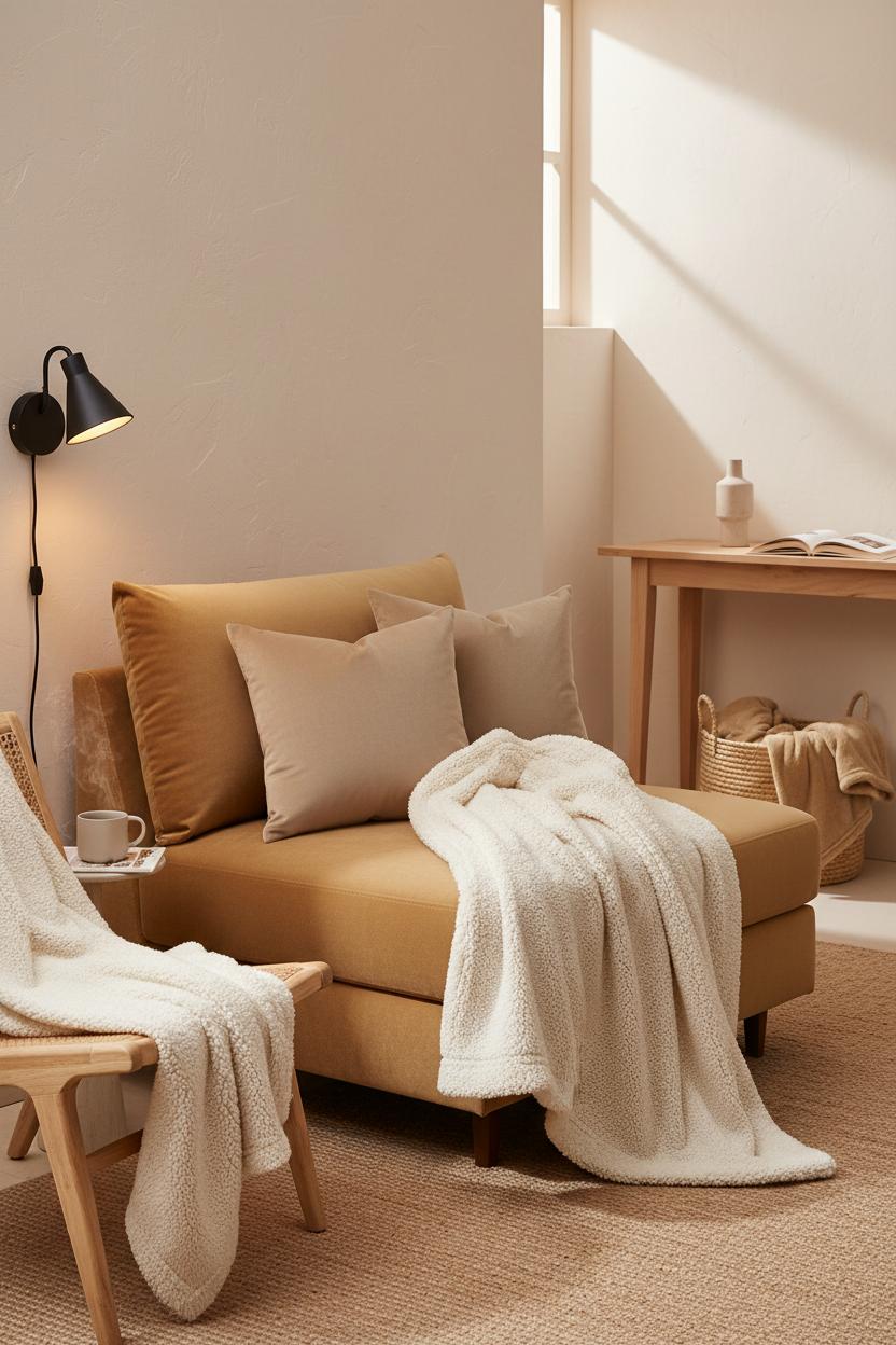 Layering your throws works the same magic. A sherpa throw blanket draped across a sofa arm or folded at the foot of the bed creates that cloud-soft look we crave in a hygge living room, and when temperatures rise, you can trade it for a breathable cotton waffle or gauzy knit without losing the sense of comfort. Try mixing one plush layer with one smooth layer to balance weight and texture; the contrast photographs beautifully and keeps the room from feeling heavy. For mood and dimension, add a plug in wall sconce near your reading nook so the light grazes those nubby weaves and soft velvets at night—instant atmosphere, zero hardwiring, very renter-friendly.