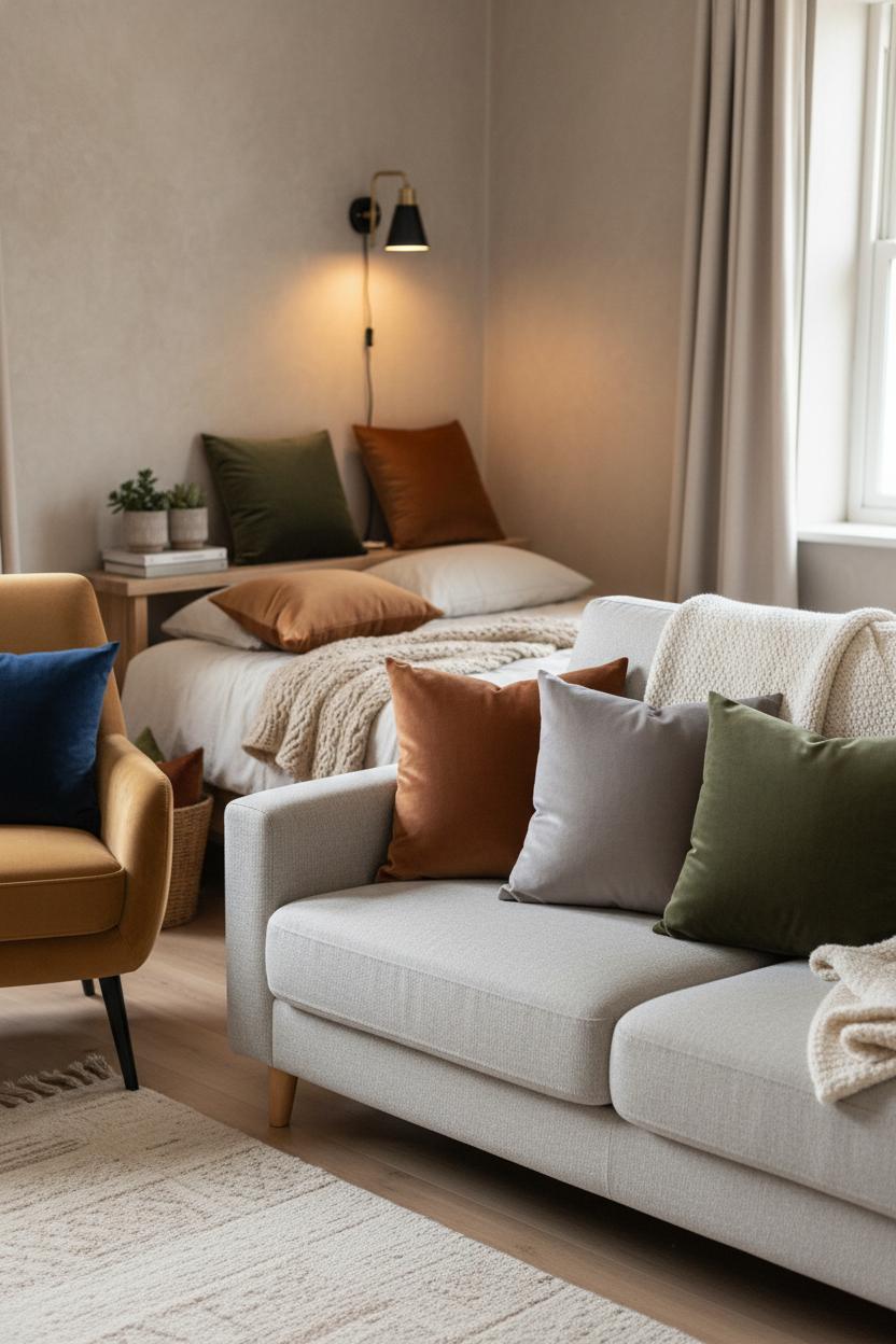When you’re working with cozy small rooms, seasonal switch-ups are the easiest way to keep everything feeling fresh without adding clutter. Think of your textiles like a capsule wardrobe for your home: rotate in velvet pillow covers for the colder months—ink, rust, olive, or deep berry tones feel luxe and instantly inviting—and then swap to lighter textures and breezier hues when the sun hangs around longer. In spring, go for linen-look covers in oatmeal or blush; in summer, try crisp white or coastal stripes that still align with a warm minimalist vibe. Because pillow inserts take up space, keep just a few you love and change the covers to suit the season; it’s a tiny move that reads as a big design moment, especially in small space decor where every detail gets noticed.