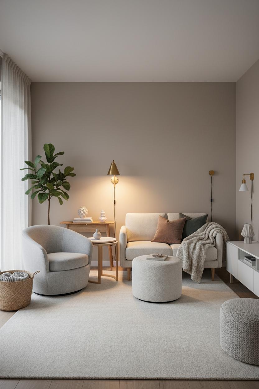 Now pad the room with touchable textures so it feels like an exhale. Layer a wool flatweave with a shag or sheepskin, drape a sherpa throw blanket over the arm, and pile on velvet pillow covers in a hushed palette—oat, clay, soft charcoal—for a warm minimalist look. Linen slipcovers, nubby knits, and a cushy ottoman you can slide around create that sink-in comfort and soften corners visually. In tiny spaces, softness isn’t just aesthetic; it quiets echoes and makes every perch inviting. Wood and brass accents keep it grounded, while simple ceramics and woven trays corral remotes and candles with calm, tactile charm.