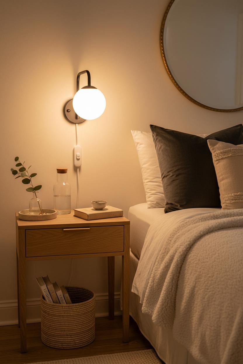 Think pairings, not clutter. Light wood or cane nightstands love brass or aged bronze sconces; marble-topped tables shine with matte-black arms. In the smallest corners, swap the traditional table for a floating shelf or a narrow console table trimmed to the length of the bed—still calm, still useful, but visually lighter. Add a dimmer to your plug in wall sconce and choose extra-warm bulbs for that almost-candlelit glow that makes a bedroom feel like a pocket of hygge living room mood. One centered piece of art or a vintage mirror above the nightstand brings balance without crowding, and a small tray corrals nightly essentials so the look stays edited.