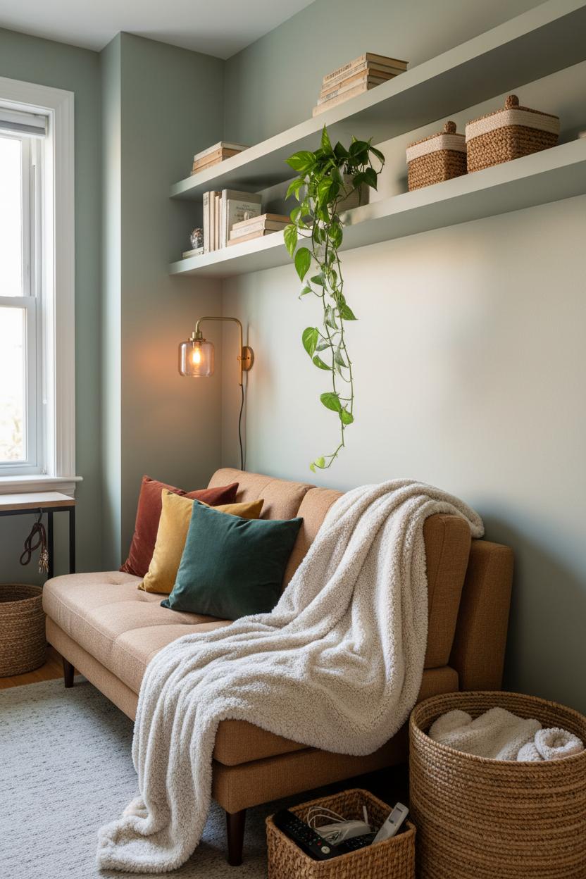 When storage seems to disappear into the room, the whole space feels calmer and more intentional. Floating shelves are the easiest sleight of hand in cozy small rooms: paint them the same color as your walls and they visually recede, leaving your favorite objects to float. Keep the styling low and layered—stack a few books, tuck in a trailing plant, and then hide the everyday bits in lidded baskets so the look stays warm minimalist rather than cluttered. Because they lift everything off the floor, shelves make small space decor feel lighter and taller, especially above a desk, sofa, or even a radiator cover. If you’re short on outlets or side tables, a plug in wall sconce beside the bed or reading chair instantly frees surface space while adding that soft, amber glow we crave when the sun dips.