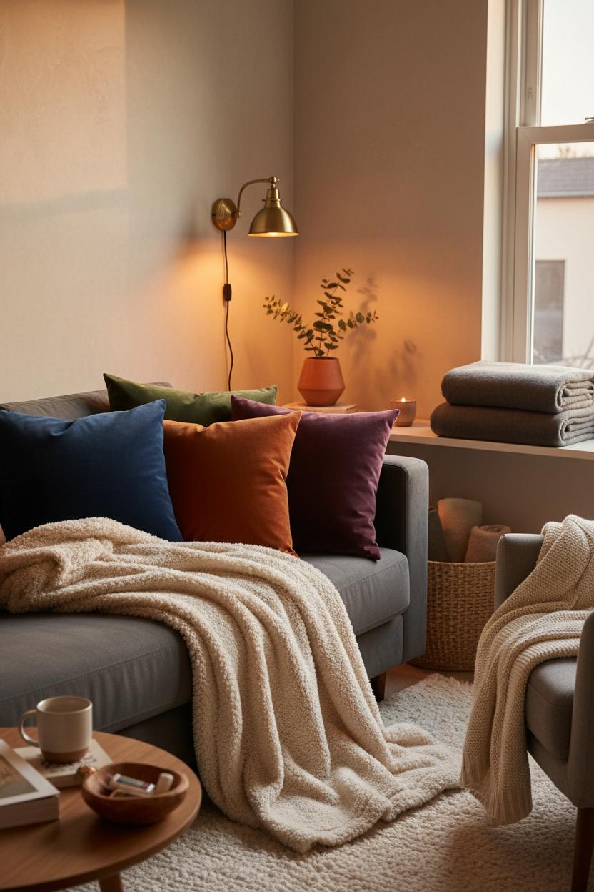 If you want a quick, affordable upgrade that makes seating feel instantly intentional, velvet pillow covers are the warm minimalist hero of cozy small rooms. Velvet’s subtle sheen bounces light without feeling flashy, so a couple of pillows can transform a compact sofa or reading chair into a soft, layered moment. Stick to a tight palette—think camel, rust, olive, espresso, or a soft stone gray—and play with scale by mixing 18×18 and 20×20 squares. Slip them over inserts that are 2 inches larger for that plush, “karate-chop” look, and let the fabric do the talking. I love pairing one smooth velvet with a nubby linen or a sherpa throw blanket for tactile contrast that still reads calm. Because they’re just covers, you can rotate colors with the seasons without committing to new pillows, which is perfect for small space decor where storage matters. Pro tip: keep a few extras folded in a basket or tucked into under bed storage bins so your winter jewel tones and spring neutrals are always within reach.