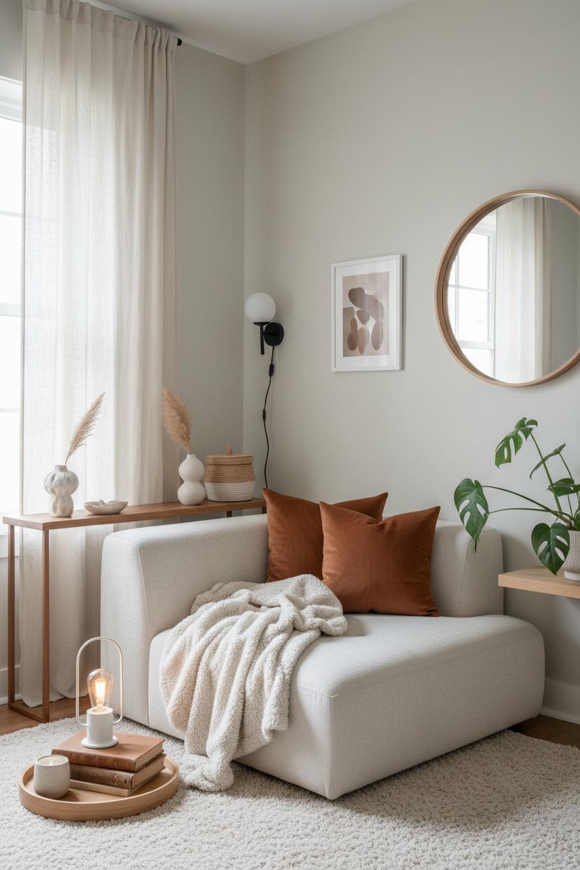 Think of cozy small rooms as little retreats where every inch is intentional and every texture invites you in. Start with a warm minimalist mindset: fewer pieces, but softer, richer materials that feel good to touch. Choose a palette that leans earthy and calm—think oat, clay, caramel—and let wood tones and woven accents bring gentle depth. A compact area rug anchors the room and keeps furniture from feeling scattered, while breezy curtains hung high draw the eye up, making low ceilings feel a bit taller. If you’re collecting small space decor, prioritize multifunctional staples and handcrafted details, then layer in glowy moments—candles, a soft table lamp, and a plug in wall sconce that adds mood without hardwiring.