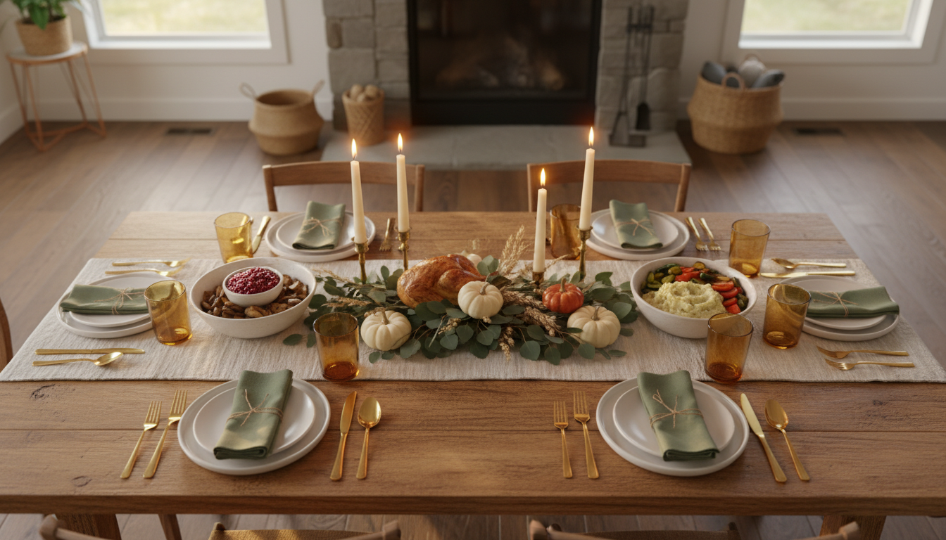If you’re gathering pieces online, look for a realistic eucalyptus garland, sturdy taper candles, a classic linen table runner, an everyday-white set of ceramic dinner plates, and a gold flatware set you’ll use all season. Combine them once, and you’ll find yourself reimagining this same centerpiece from harvest dinners through New Year—effortless, beautiful, and wonderfully welcoming.