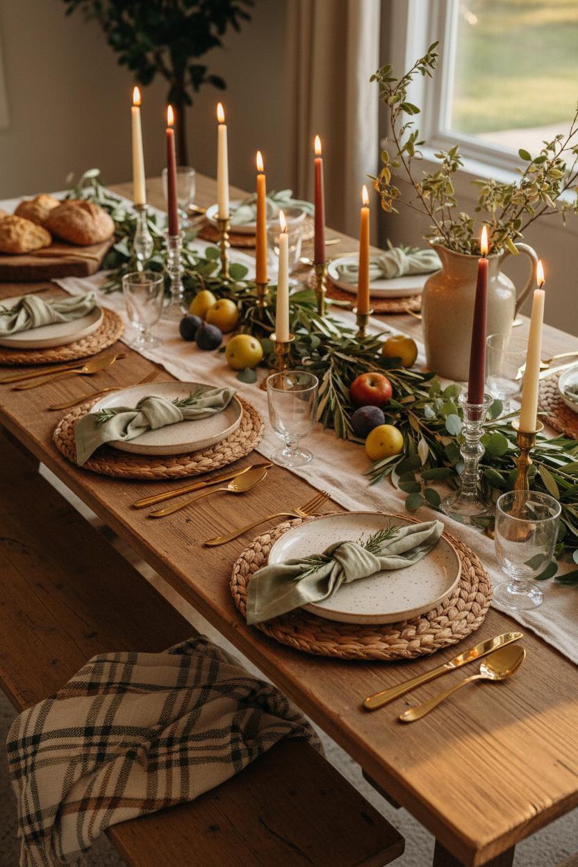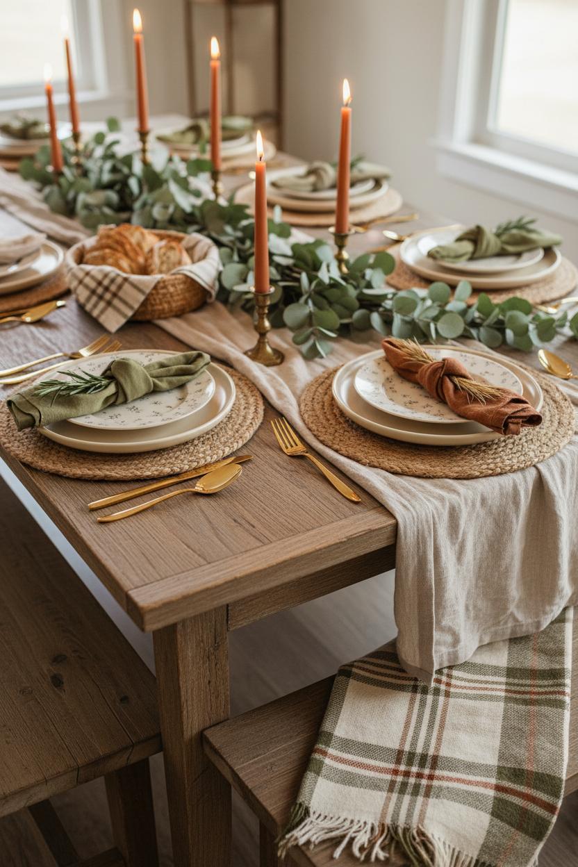 Layering continues at each place: stack ceramic dinner plates with a delicate salad plate, then drape a napkin either between the layers or off to the side for a relaxed, gathered look. A gold flatware set adds a subtle glint that warms up the textiles and elevates your holiday place settings. Down the center, weave an eucalyptus garland along the linen runner and nestle taper candles in vintage-inspired holders—the interplay of greenery and flicker turns your linear styling into an organic thanksgiving centerpiece that feels lush but unfussy. Slip a folded tea towel under a bread basket, add a mini plaid throw across the bench, or tie ribbon around napkin bundles for that handmade, heirloom touch. The magic is in contrast: soft linens against woven mats, matte plates next to luminous cutlery, structured runners softened by flowing greens. This easy, layered approach keeps your fall tablescape cohesive and comfortable, and it’s the kind of detail-rich styling that makes everyone feel at home while still delivering the rustic table ideas you love.