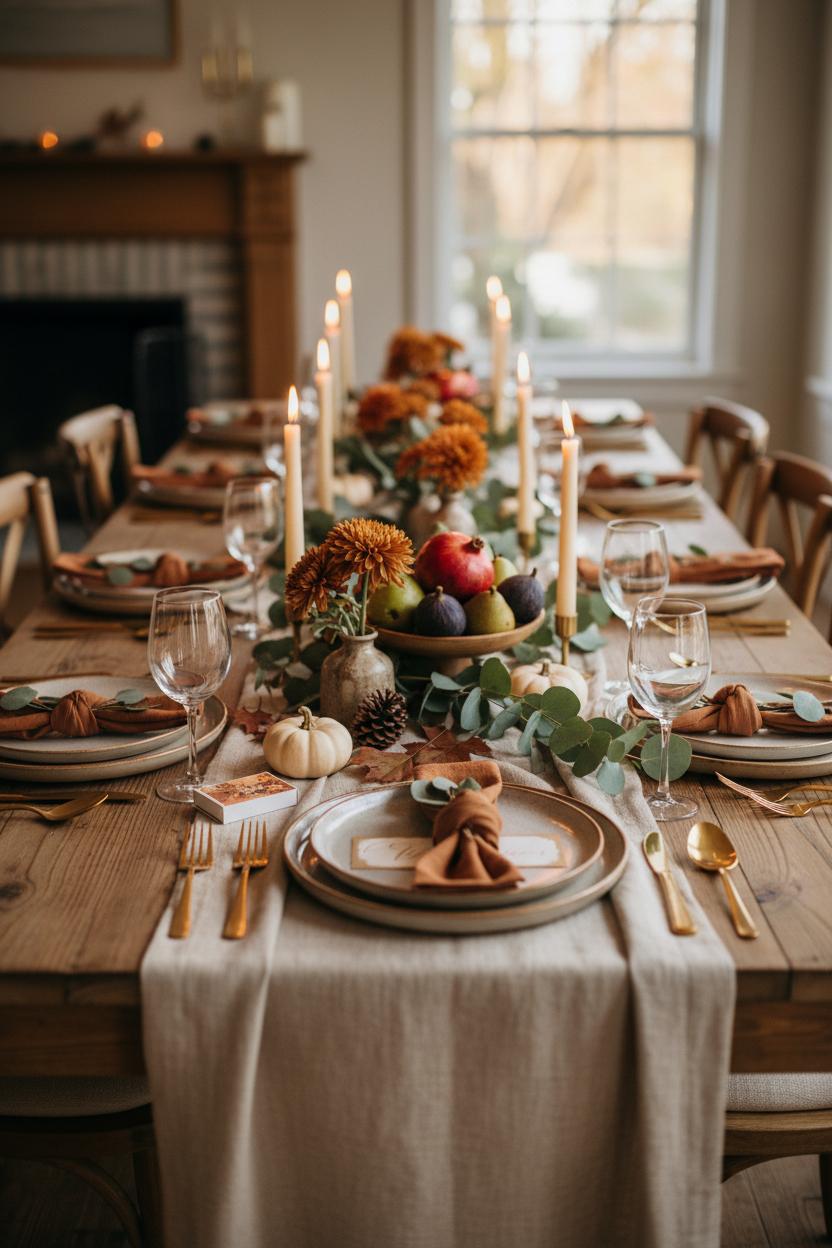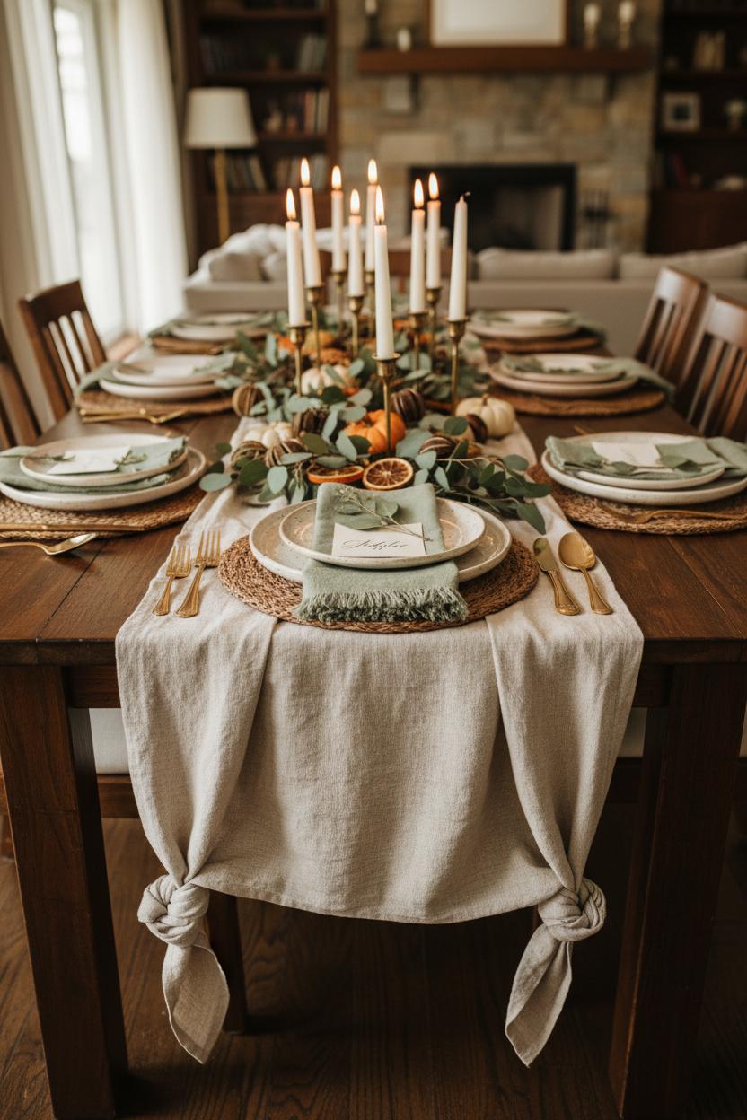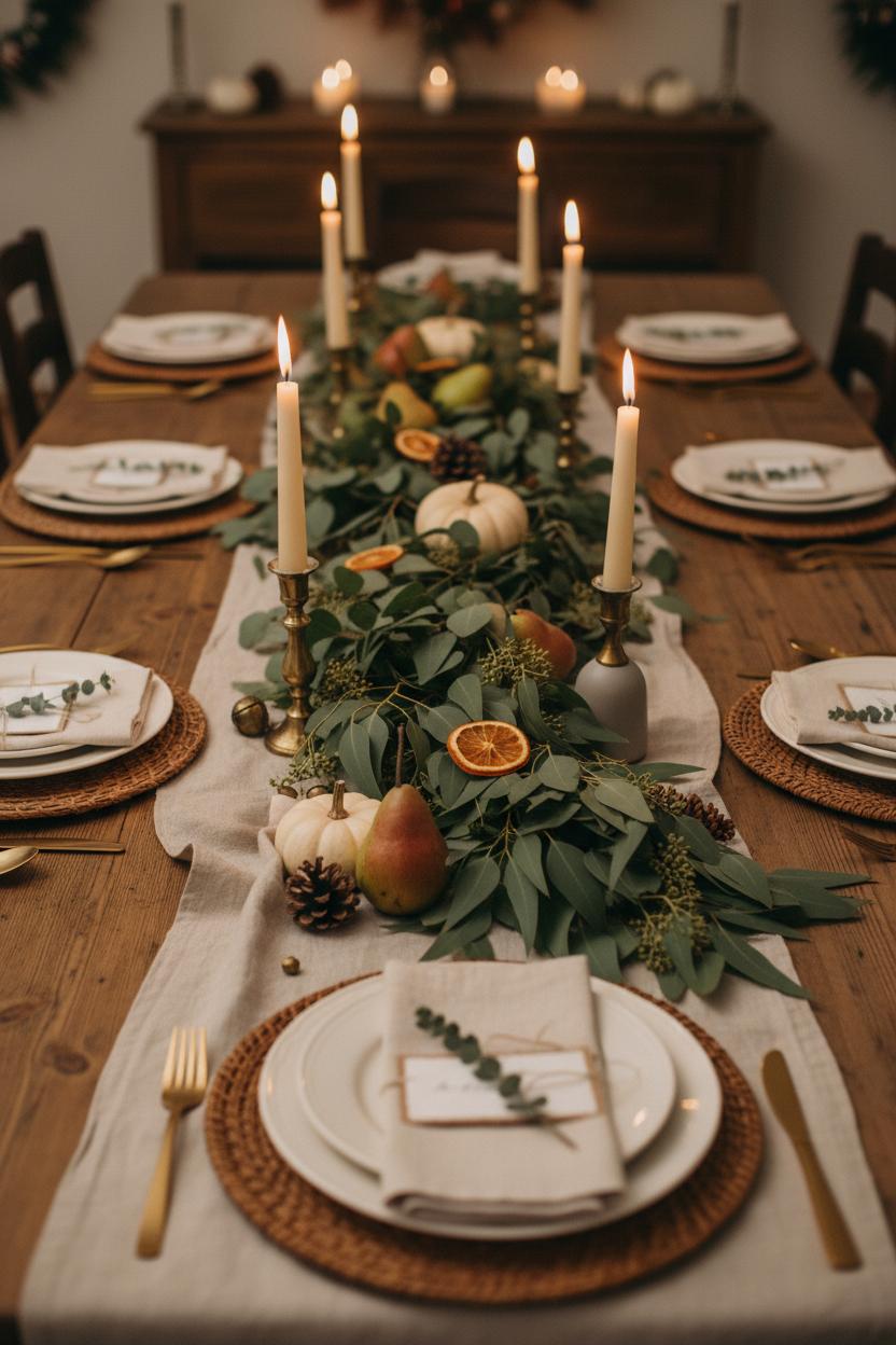 Once the runner is down, tuck in something organic. A wispy eucalyptus garland instantly brings that soft green that makes warm wood and linen sing, and it’s the perfect guide for nestling taper candles at varied heights. Alternate candles with tiny clusters of woodland finds—acorns, dried citrus, or mini pumpkins—so your thanksgiving centerpiece looks abundant but not fussy. Keep your palette in the warm family: honeyed brass, creamy whites, and a hint of sage. That way, when the lights dim, the whole fall tablescape glows. If you prefer a cleaner look, try a single trailing garland dotted with just three candle moments; the negative space lets the runner’s texture show off.