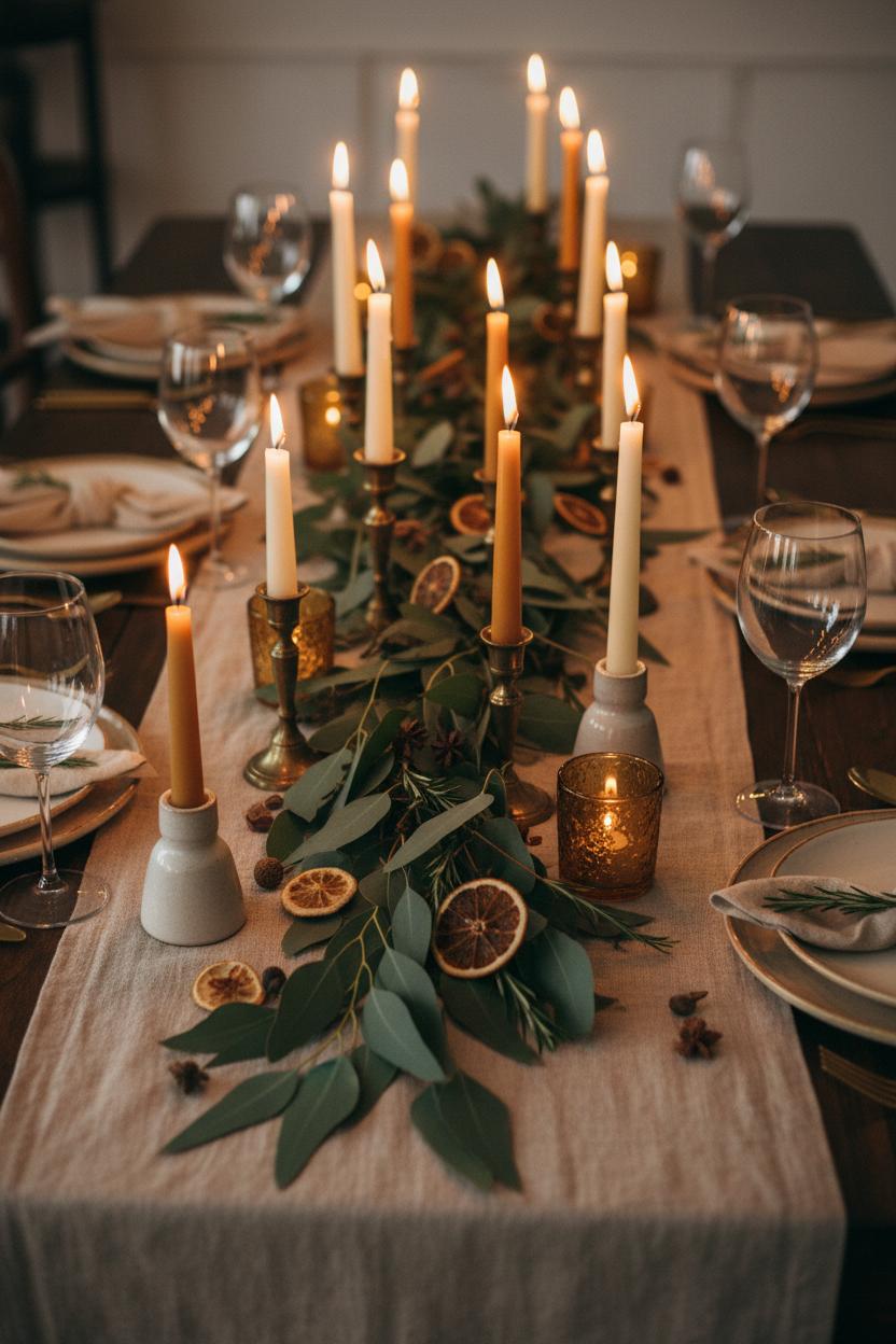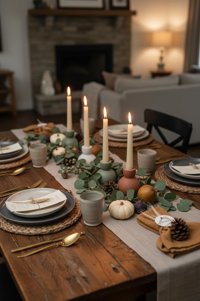 Think of the candles as your quiet thanksgiving centerpiece, low enough to keep sightlines clear but dramatic in their glow. Choose creamy or honeyed taper candles that echo fall’s cozy palette, then tuck them between sprigs of eucalyptus and tiny clusters of foraged seed pods or dried citrus slices for a subtle fall tablescape moment. As the flames reflect in a gold flatware set and skim the rim of ceramic dinner plates, there’s a soft shimmer that elevates even the simplest holiday place settings—try a knotted linen napkin with a sprig of rosemary set above each plate. If you’re craving a little extra depth, slip in a few amber glass votives for a warm ember-like twinkle without competing with the taller lights. It’s one of my favorite rustic table ideas because it balances romance with an easy, lived-in charm.