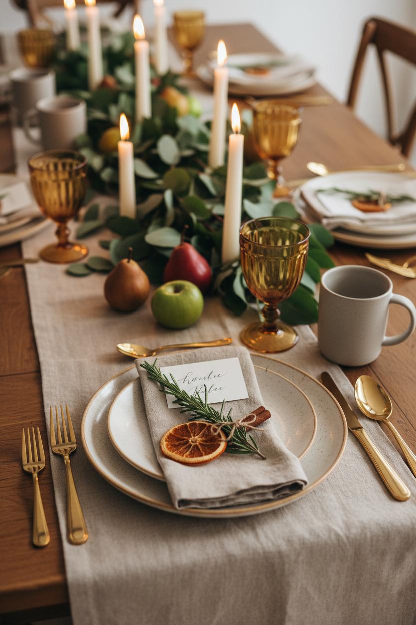 Round it out with holiday place settings that feel personal and welcoming. Slip a sprig of rosemary or a tiny wheat bundle under each napkin, tie menu cards with twine, or clip a name tag to a mini pinecone. Layering small, tactile details is what makes the table feel thoughtfully gathered rather than staged. Keep the color story tight and repeat materials—linen, wood, greenery—so the eye moves easily from plate to glass to centerpiece. With a few well-chosen pieces like a linen table runner, ceramic dinner plates, a gold flatware set, taper candles, and a simple eucalyptus garland, your fall tablescape becomes a warm invitation to linger, laugh, and savor the feast.