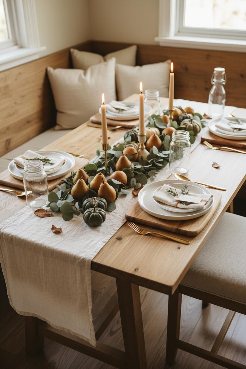 For a budget-friendly thanksgiving centerpiece, let the grocery store do the heavy lifting. Cluster a few seasonal pears and mini pumpkins down the runner, then weave in an eucalyptus garland for softness and scent. Add slim taper candles in mismatched holders for height without crowding the conversation. This low-and-long approach is perfect for small spaces and feels like the easiest of rustic table ideas—romantic, unfussy, and practical. If you don’t have space for a full floral moment, tuck a single branch in a narrow vase, or scatter clipped leaves between the candles; the glow will do the rest. Keep candles unscented so they don’t compete with dinner, and stick to odd-number groupings to avoid visual clutter.