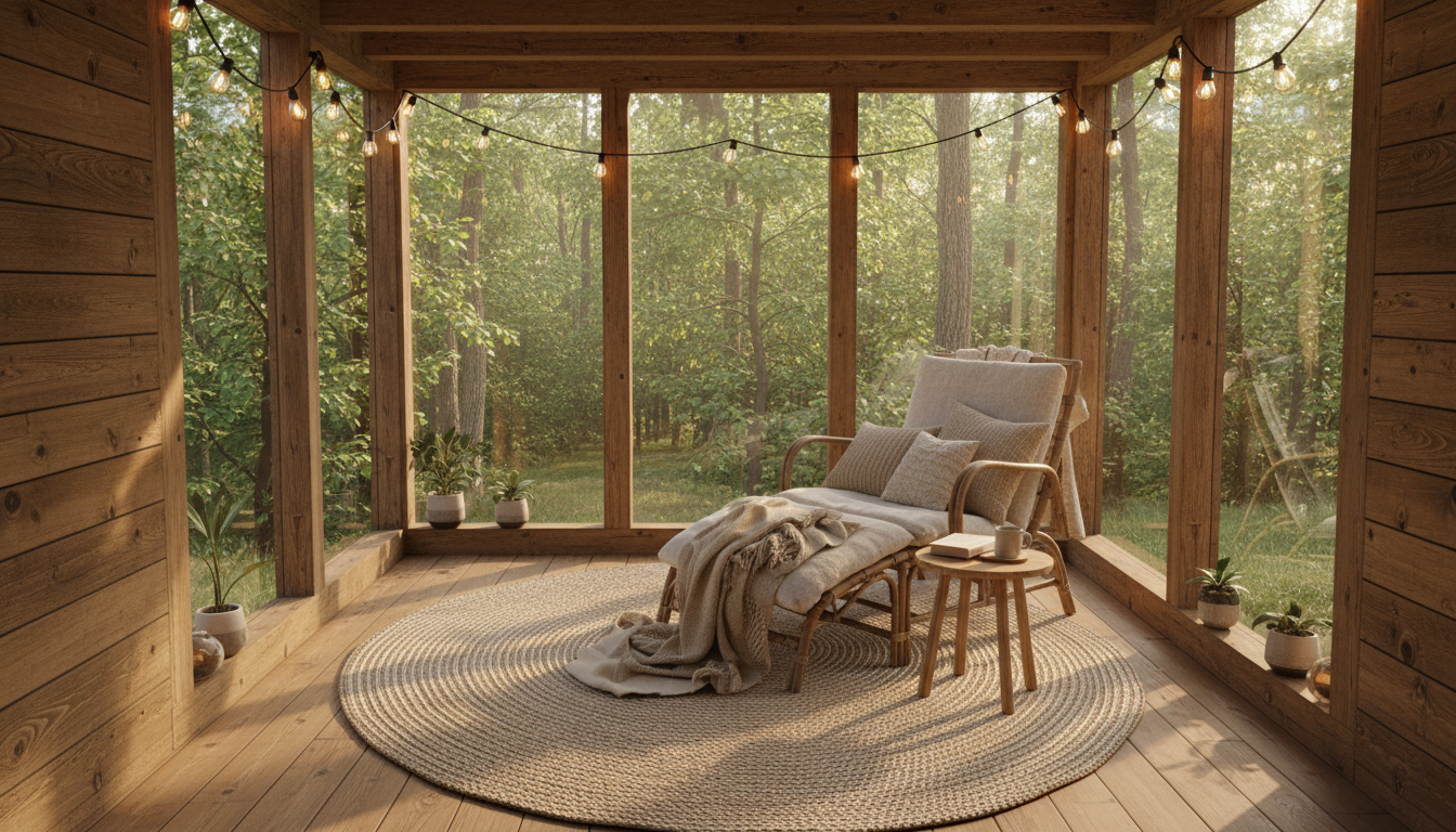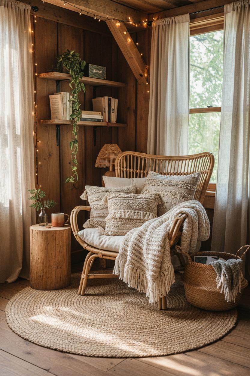 Tucked into a sunny corner of your treehouse interior, a reading nook becomes the heart of the whole space—quiet, cocooning, and just boho enough to feel a little magical. Start with a rattan lounge chair as the anchor: the airy curves keep things feeling light and effortless, which is key for small space design, while the woven texture adds instant warmth. Pile on boho throw pillows in mixed neutrals and subtle patterns—think tassels, tufting, maybe a hint of rust or moss—to bring that cozy decor vibe without overwhelming the eye. A soft throw draped over the arm invites lingering, and the natural fibers echo the surrounding trees, reinforcing that boho cabin-meets-rustic living mood. It’s all about layers that look collected, not cluttered, so keep the palette earthy and pull in one accent hue from your pillows to repeat in a candle, a ceramic mug, or a tiny bud vase.