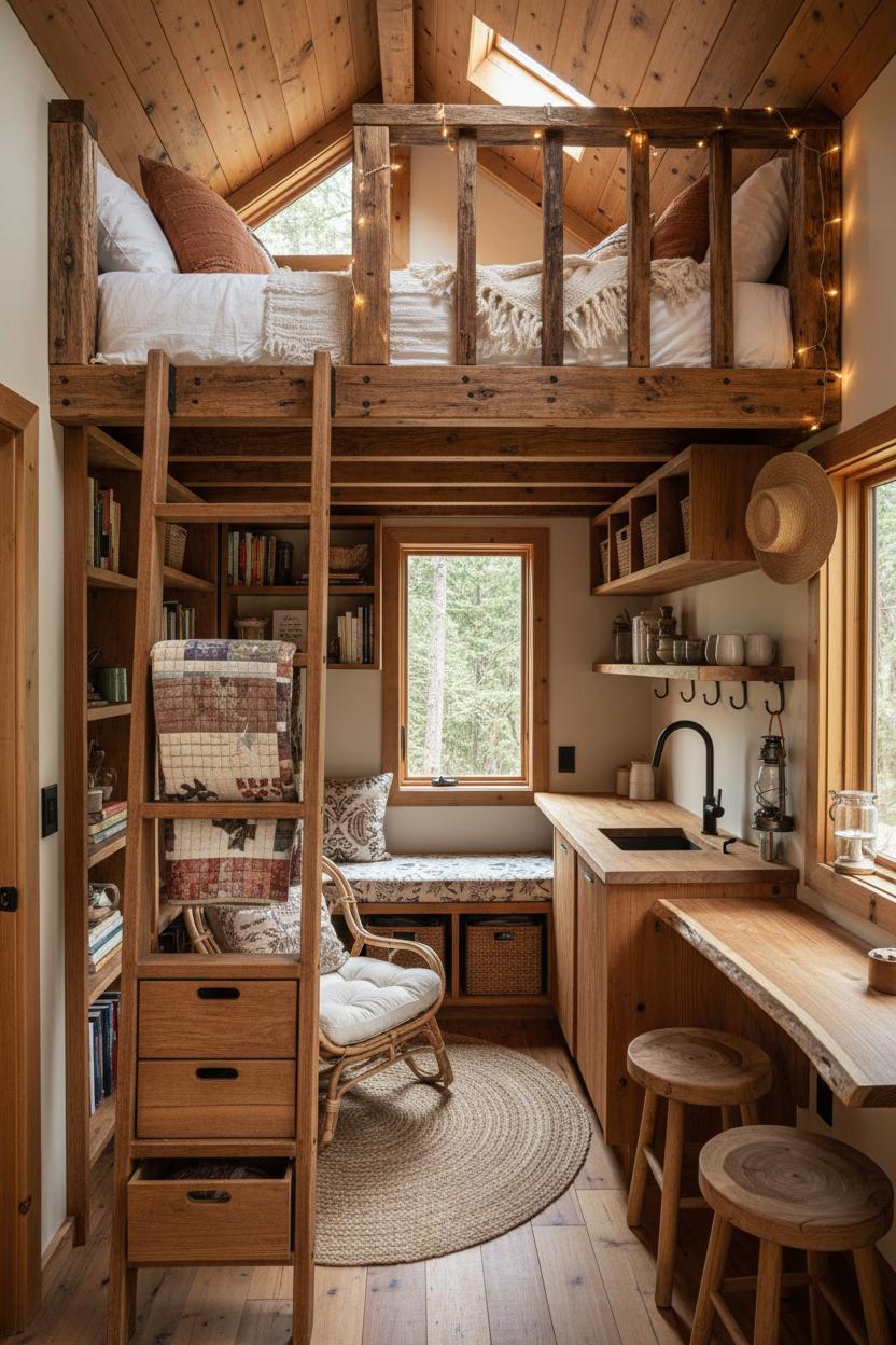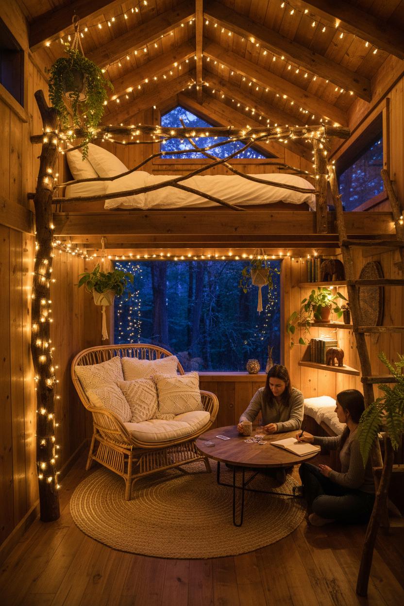 When square footage is scarce, go vertical. A lofted bed instantly doubles the usefulness of any treehouse interior, carving out a breezy sleep perch up top and a hardworking nook below. Tuck a rattan lounge chair and a low bookshelf under the platform to craft a snug reading den, then roll out a jute area rug to soften creaky floorboards. String lights warm white drape beautifully along the rail for ambient glow that feels like fireflies in a jar. Stairs or a sturdy ladder can multitask with drawers in the risers—perfect for extra quilts, board games, and that never-ending stack of paperbacks. Keep the bedding layered with boho throw pillows and nubby blankets so the nook reads as intentional cozy decor, not overflow storage, and you’ll gain a miniature living room without sacrificing the dreamy, tucked-away vibe of a boho cabin.