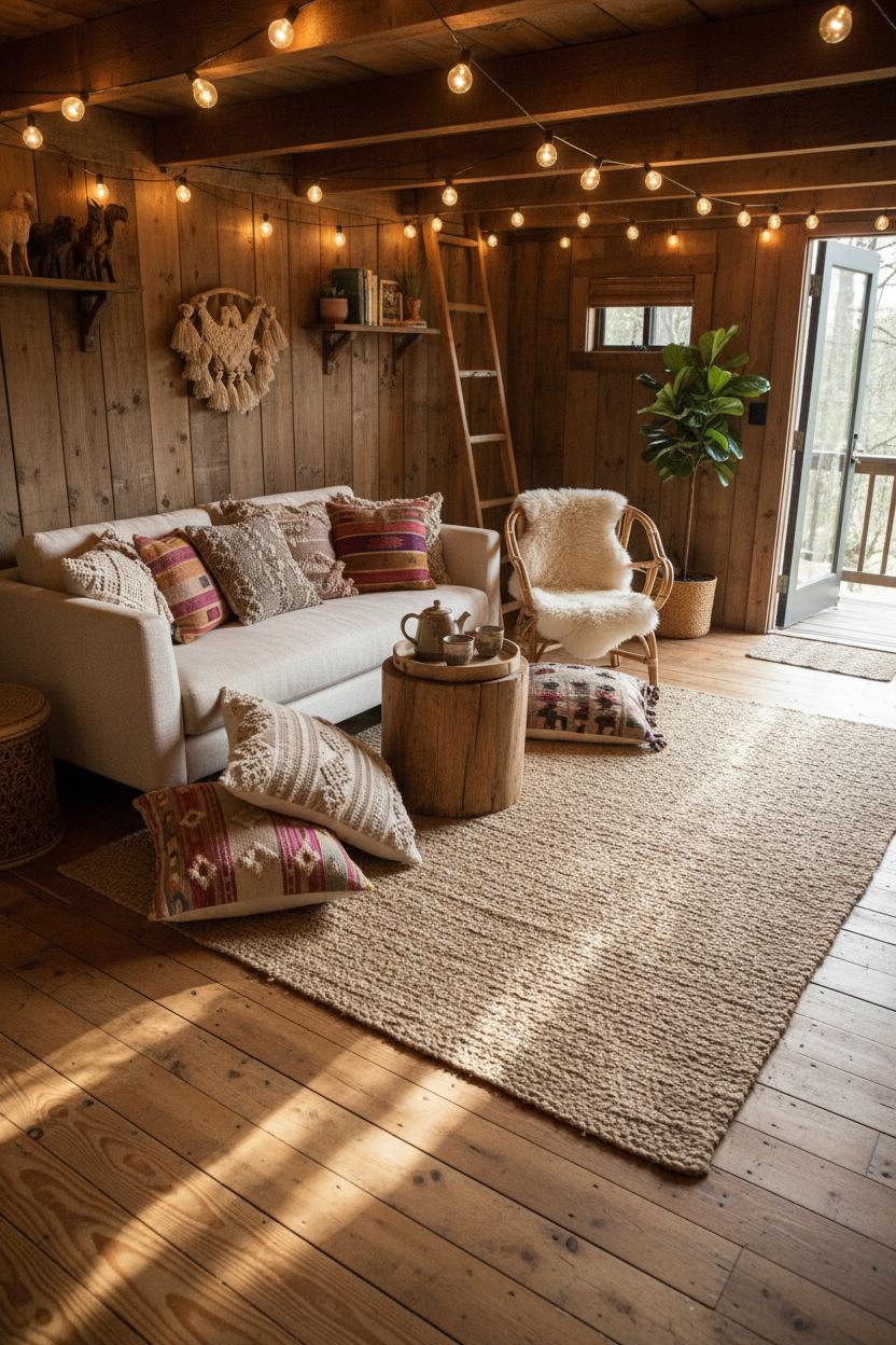 When you’re dreaming up a treehouse interior that feels like a hug, start with a palette pulled straight from the forest floor. Think warm woods in honey and caramel, earthy clay and terracotta accents, creamy oatmeal textiles, and a grounding thread of charcoal or matte black to keep it from going overly sweet. Those sun-baked neutrals make small space design feel calm and cohesive, and they’re forgiving when life gets a little muddy. Layer in textures that whisper rather than shout—slubby linen, chunky knits, and nubby wool—to build that cozy decor magic. A low-slung rattan lounge chair sets an easygoing boho cabin tone, especially when draped with boho throw pillows in muted patterns (mudcloth, tiny ikat, or a faded kilim). Underfoot, a jute area rug anchors the whole scene with an organic weave that plays beautifully against knotty pine floors.