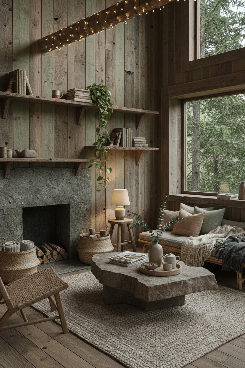 Start with the bones: a treehouse interior begs for weathered, story-rich materials that make the canopy outside feel like an extension of your living room. Think reclaimed wood walls with knots and saw marks you can actually trace with your fingertips, and a slab of natural stone used as a hearth, a windowsill perch, or even a tiny coffee table. This mix sets an instant rustic living mood that feels grounded and timeless, especially when you keep the palette earthy—mossy greens, warm taupes, and charcoal—so the grain and mineral textures shine. For small space design, keep surfaces light and vertical: floating wall shelves in a live-edge finish turn any awkward nook into display and storage, showcasing well-loved books, a ceramic mug, and a trailing plant. If you’re chasing a boho cabin vibe, add a cane or woven accent here and there—nothing too perfect, just easygoing, like it grew there.