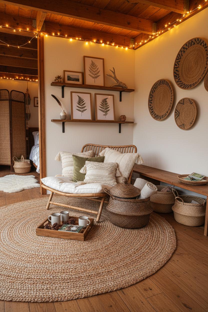 Underfoot, roll out a jute area rug to ground the room and connect every element. The nubby, sun-kissed fibers echo the baskets and instantly warm up the floorboards, while the neutral tone lets your art and textiles sing. Jute is a natural fit for cozy decor—it hides a little dirt, loves to be layered with a sheepskin by the bed, and creates clear zones so a compact sitting area feels intentional. Add a low tray for mugs and pinecones, nest a basket beside the chair for throws, and let the rug define the rhythm of everyday life up in the trees. With these finishing touches, your rustic living moment feels complete: relaxed, tactile, and quietly beautiful.