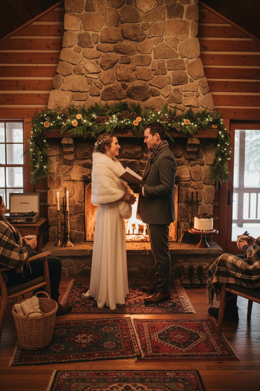 Time your ceremony for late afternoon so the room deepens into candlelight while the flames dance; the glow becomes your filter, giving instant snowy wedding inspiration even if the storm stays outside. If you’re planning a mountain wedding, take a quiet moment before the vows for a private promise by the hearth, then invite your photographer to capture the two of you framed by the stonework and garland. Keep florals textural and wintry—evergreen, juniper, and white blooms—so the backdrop remains timeless. After the kiss, trade a recessional for mugs of mulled wine or hot cocoa and a s’mores toast right in the fireplace nook. The magic is in the details: a simple cake topped with sugared cranberries, a vinyl record spinning your first dance beside the fire, snow boots waiting by the door for a quick step outside to breathe in the night. With thoughtful layers and a glow-forward palette, a fireplace ceremony turns your cabin into a sanctuary—intimate, cinematic, and perfectly you.