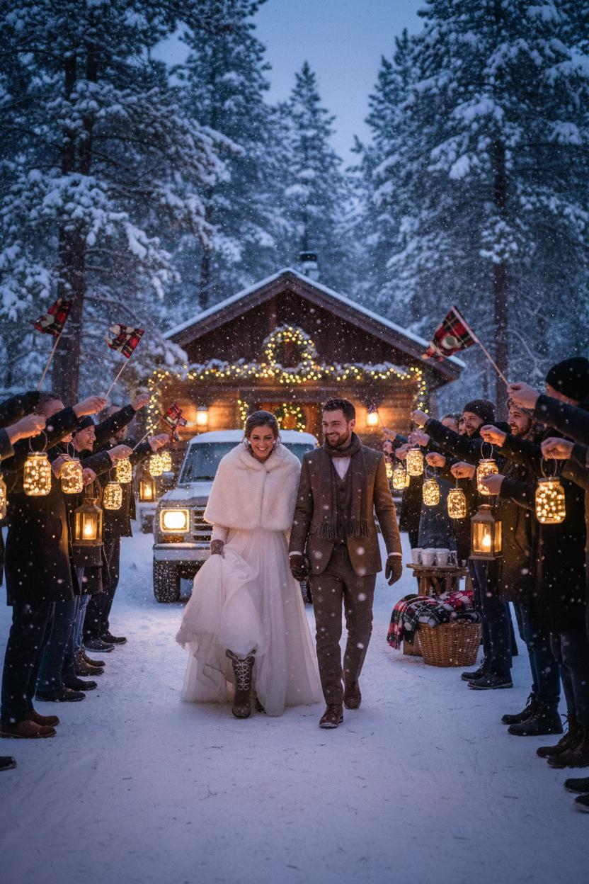 When the snow is falling and the pine trees are dusted like powdered sugar, a sparkler send-off can sound dreamy—but many venues (and mountain weather) make fire a no-go. Lean into the magic with glow and texture instead. Hand out small lanterns or cluster LED string lights in mason jars so your guests become a twinkling tunnel of light as you walk through. Jingle bells tied to ribbon capture that holiday-quiet sparkle without any flame, and ribbon or lace wands flutter beautifully against the night sky. For a doorway moment, swag evergreen garland around the cabin entrance and tuck in warm white LEDs for that storybook shimmer. If your winter cabin wedding has kids on the guest list, give them snow-safe pom-poms to toss, or invite everyone to wave mini plaid flags—it’s festive, photogenic, and easy to clean up in fresh powder. Keep guests comfy with a basket of plaid throw blankets and little hand warmers at the door, and don’t forget a hot cocoa or mulled cider station waiting at the finish line.