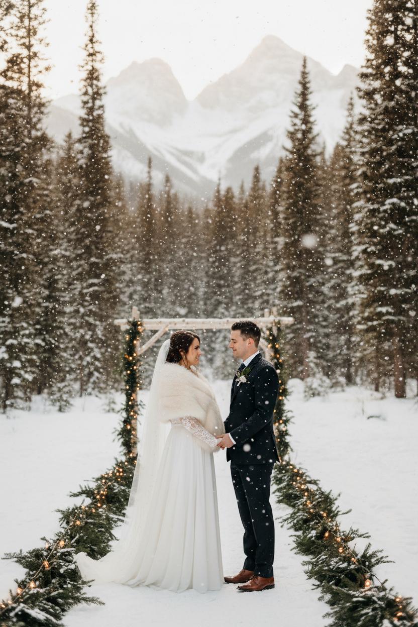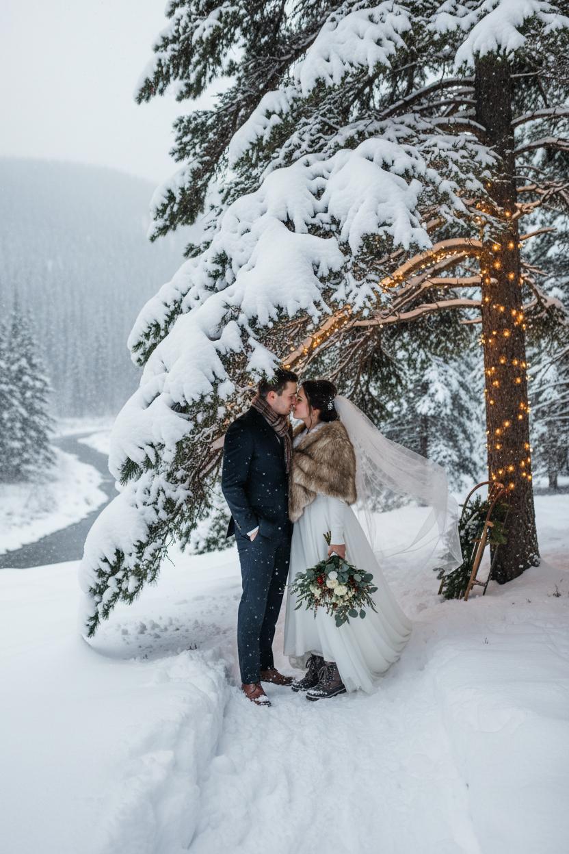 When the forest is blanketed in fresh powder, the world turns quiet and magical—perfect for those cinematic portraits you’ll treasure forever. Imagine your first look tucked between towering pines, snow muffling every sound, breath rising in little clouds as you pull each other close. A faux fur bridal wrap adds texture and warmth (and photographs like a dream), while hand warmers hide in pockets so you can linger in the moment. For a classic winter cabin wedding vibe, let your photographer frame you against the dark green needles and white drifts, capturing that soft light that only a mountain wedding morning can give. Think windswept veil, boots peeking from the hem, and a bouquet of winter greens that ties everything back to the landscape.