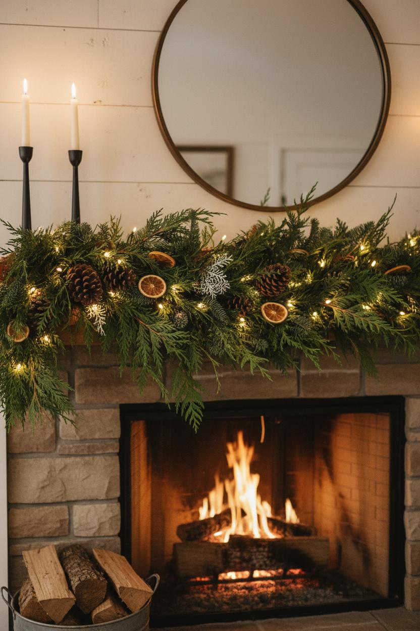 Bring the forest inside and let it frame every moment with evergreen garland draped over mantels, stair rails, and rafters, the soft scent of pine curling into the warmth of the fire. Tuck in clusters of pinecones, cedar tips, and a few dried orange slices for a hint of color, then weave LED string lights through the greenery so the whole room twinkles like starlight after snowfall. For instant snowy wedding inspiration, line the ceremony aisle with wood rounds and lanterns, then anchor your backdrop with a branch-built arch wrapped in garland and winter greens. Carry the look to your tables with wood-grain touches—think walnut charger plates, bark-edged frames for table numbers, and wood-burned place cards that feel handmade and heartfelt. Glass hurricanes filled with pinecones and tea lights give a cozy glow, while a simple buttercream cake on a cross-cut wood stand ties the woodland story together for a dreamy mountain wedding.
